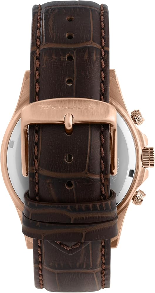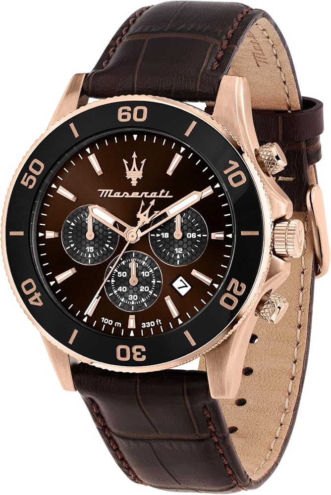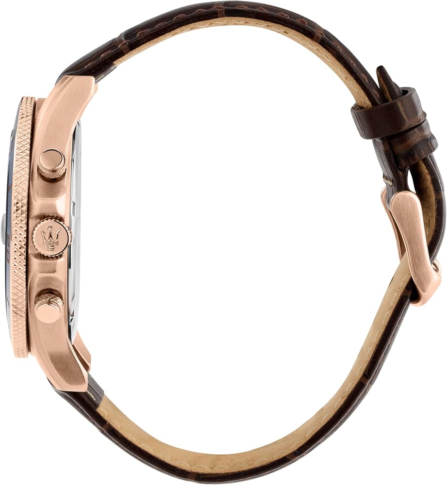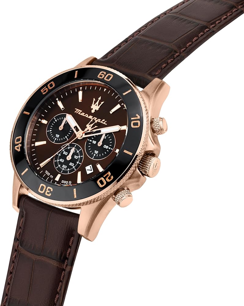 Features: The Maserati watch case measures 43.00 mm, 11.20mm thick. The brown dial consists of a sapphire crystal. Rotating bezel with black ceramic and rose gold details. The watch consists of a practical clasp clasp