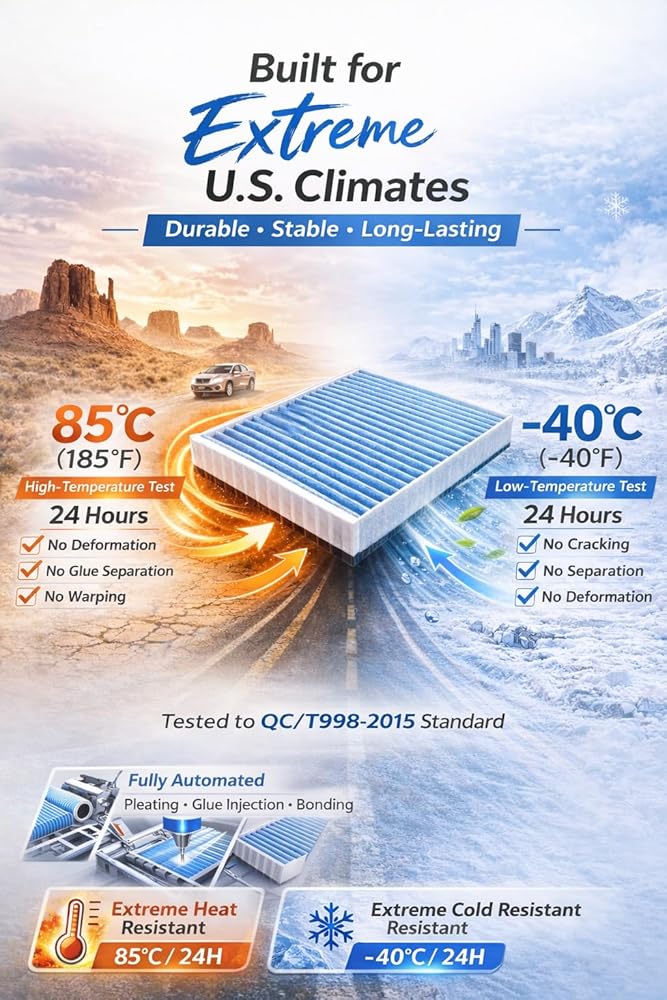 [High Capacity & All-Weather Durability] - Built for the American road, from the scorching Texas sun to freezing Midwestern winters. Featuring a heavy-duty 180g/㎡ Triple-Layer structure (120g PET Microfiber Layer + Reinforced Support Layer + H11 Electrostatic Melt-blown Layer), this VASHEN cabin air filter offers superior dust-holding capacity for longer service life. Rigorously tested to withstand temperatures from -40°F to 185°F (-40°C to 85°C), this structure won't warp, crack, or produce glue-related odors, maintaining structural integrity even on long-distance hauls.