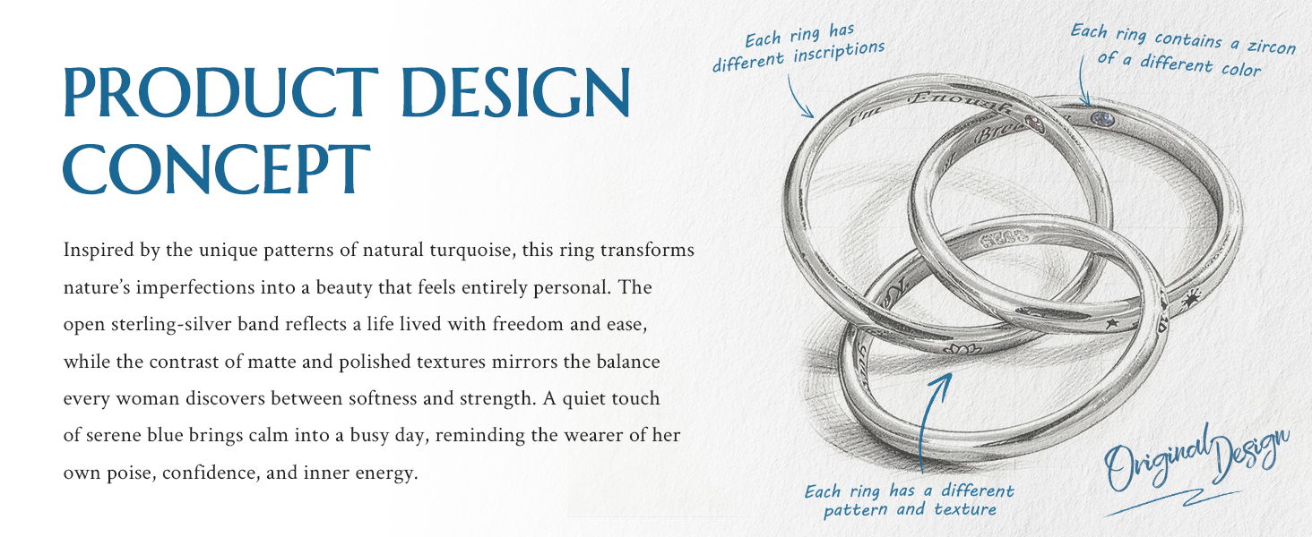 Three rings, three stones, three life lessons—bound together in one graceful design. The first ring bears a deep black cubic zirconia, etched with a mountain and engraved inside with “Keep Going”, symbolizing resilience and the determination to rise above every challenge. The second ring sparkles with a purple-blue stone, adorned with a delicate dandelion and the words “I'm Enough”, a gentle reminder to embrace your worth and live authentically. The third ring glows with a sea-blue stone, resting on a lotus with “Just Breathe” engraved inside, inspiring peace and balance through life's shifting seasons. Together, they form a personal talisman—an everyday promise that you are strong, worthy, and at peace.