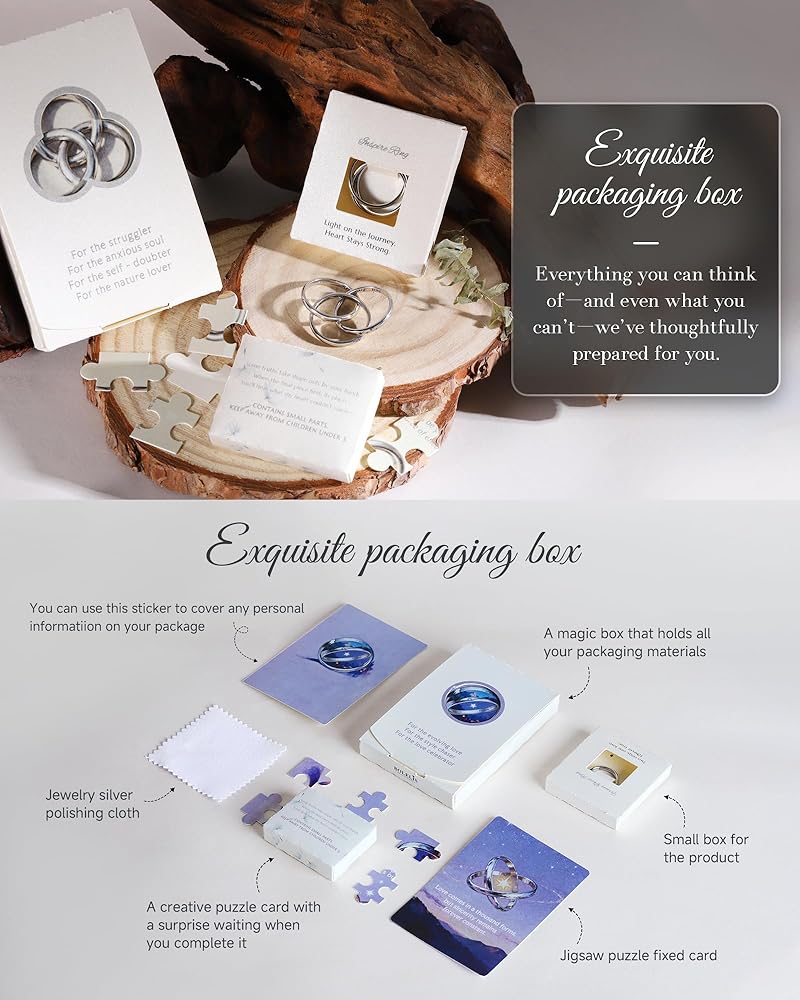 • Three Rings, Three Messages – Interlocking rings engraved with Mountain – Keep Going, Dandelion – I'm Enough, and Lotus – Just Breathe, each carrying a unique symbol of strength, self-worth, and inner peace.