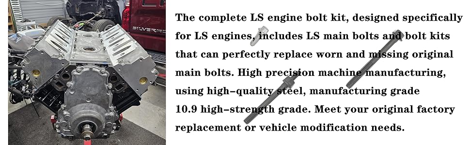 COMPLETE ENGINE BOLT KIT: Comprehensive set of main bolts and studs specifically designed for LS engine series including 4.8L, 5.3L, 5.7L, 6.0L, and 6.2L variants (LS1, LS2, LS3, LQ4, LM7, LC9, LR4, L96, L76)