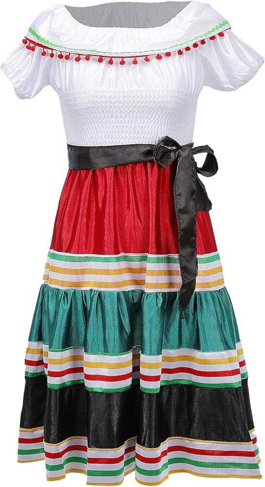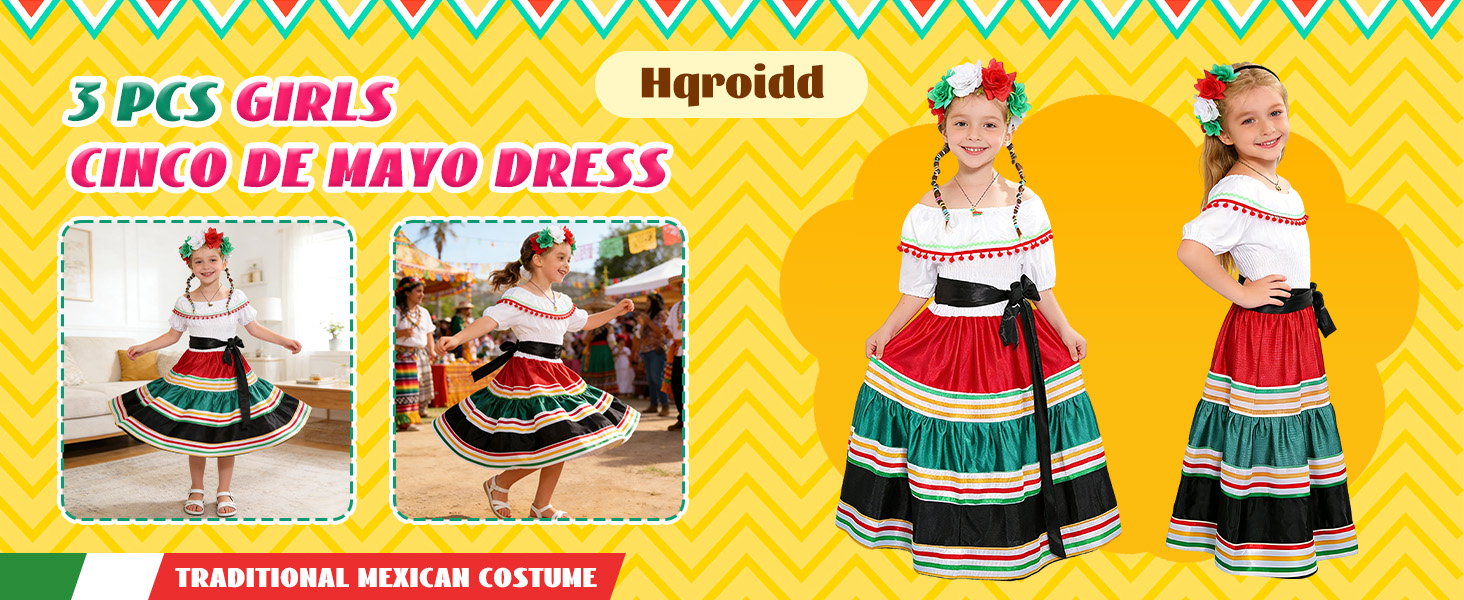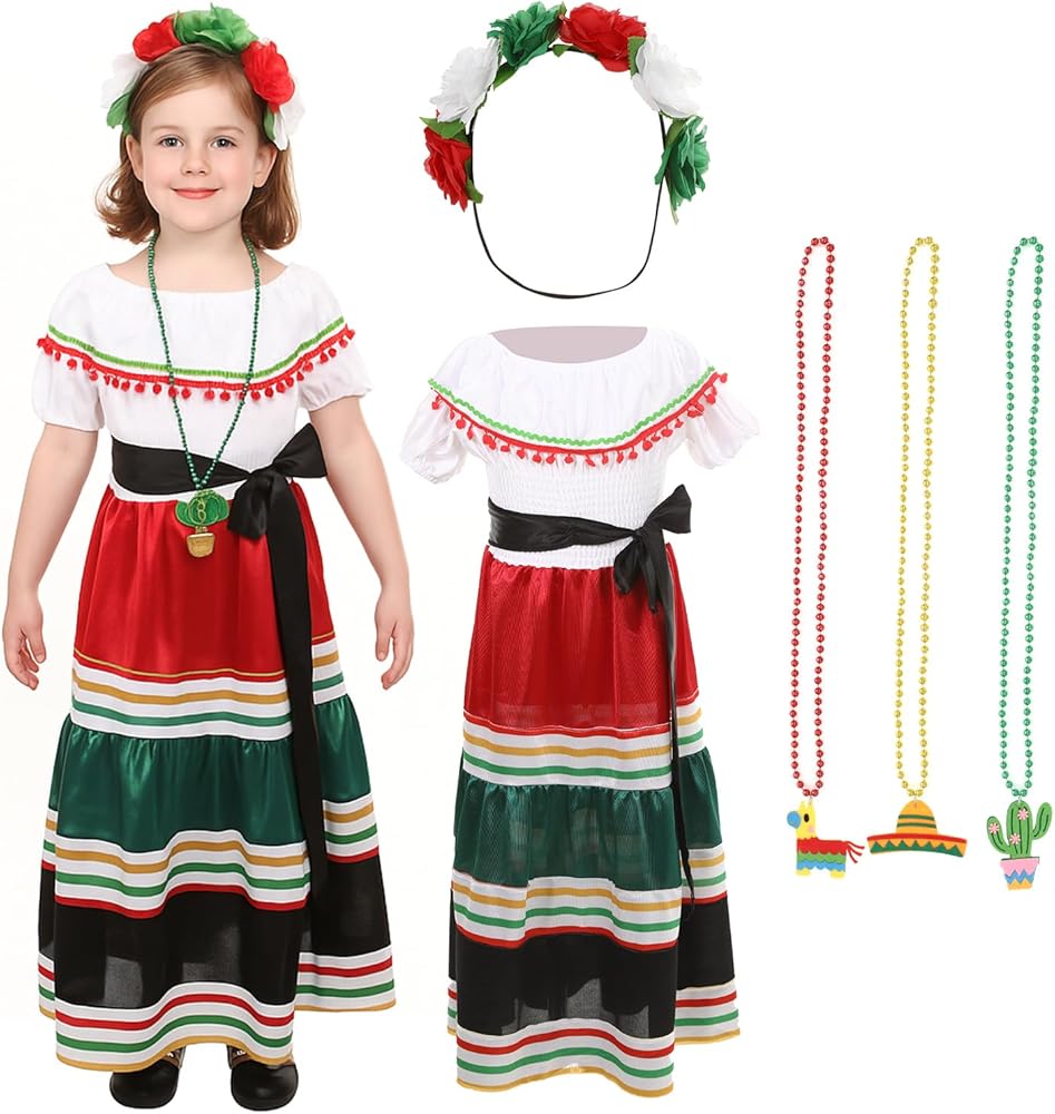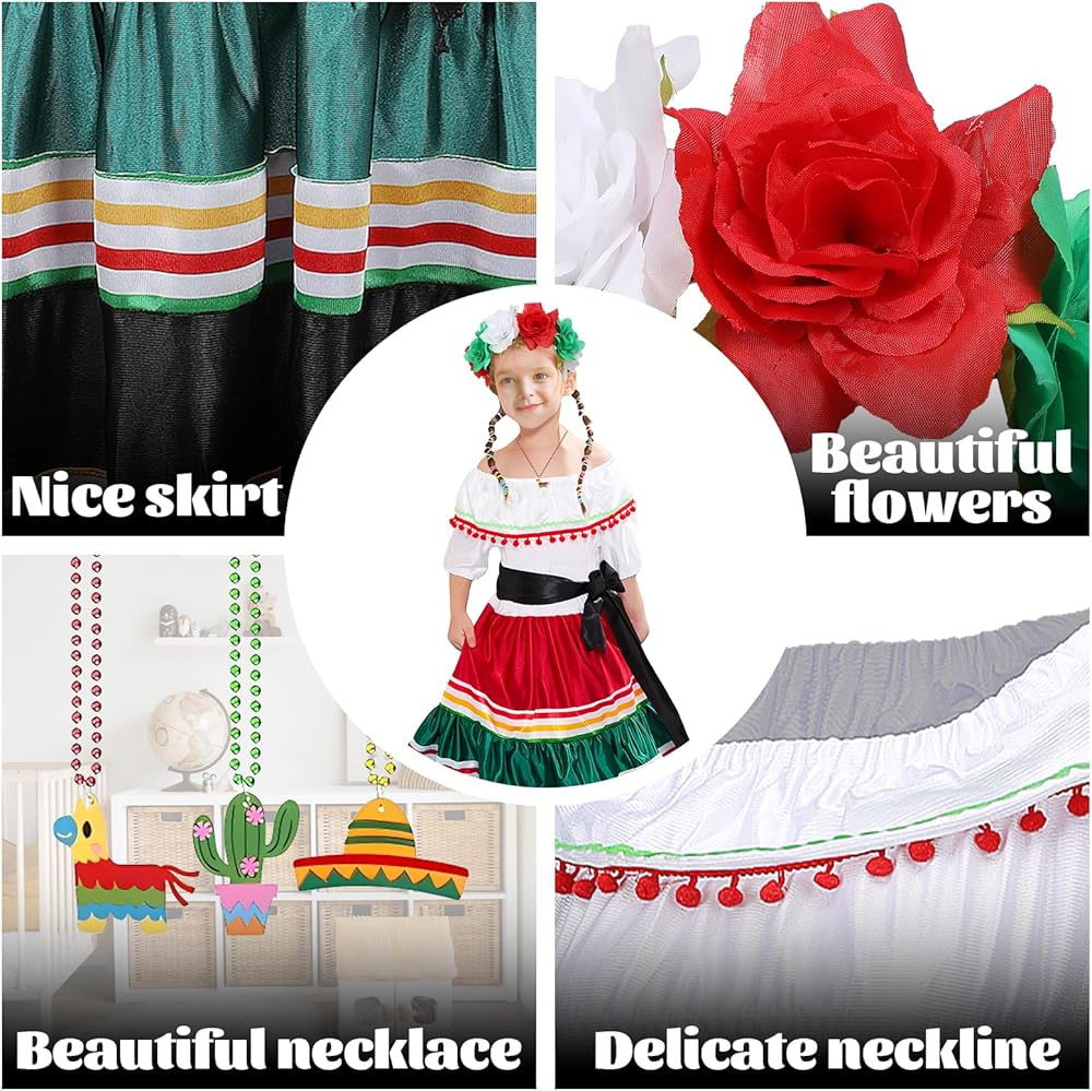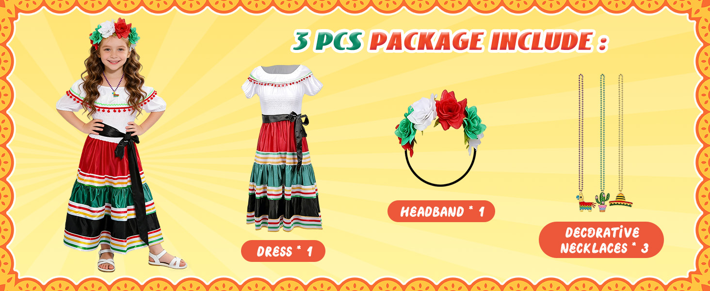 【3Pcs Mexican Dress for Girls】Traditional mexican dress include a spanish dress, a rose flower mexican headbands and cute necklace. Taking all the attention on your little one with this traditional mexican dress.