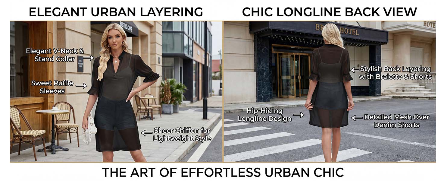 Elegant Sheer Chiffon Design:Features a sheer chiffon overlay design with a stand collar and v-neck combo, paired with ruffled bell sleeves—adds soft, feminine charm to any look. Includes a built-in cami for subtle coverage.