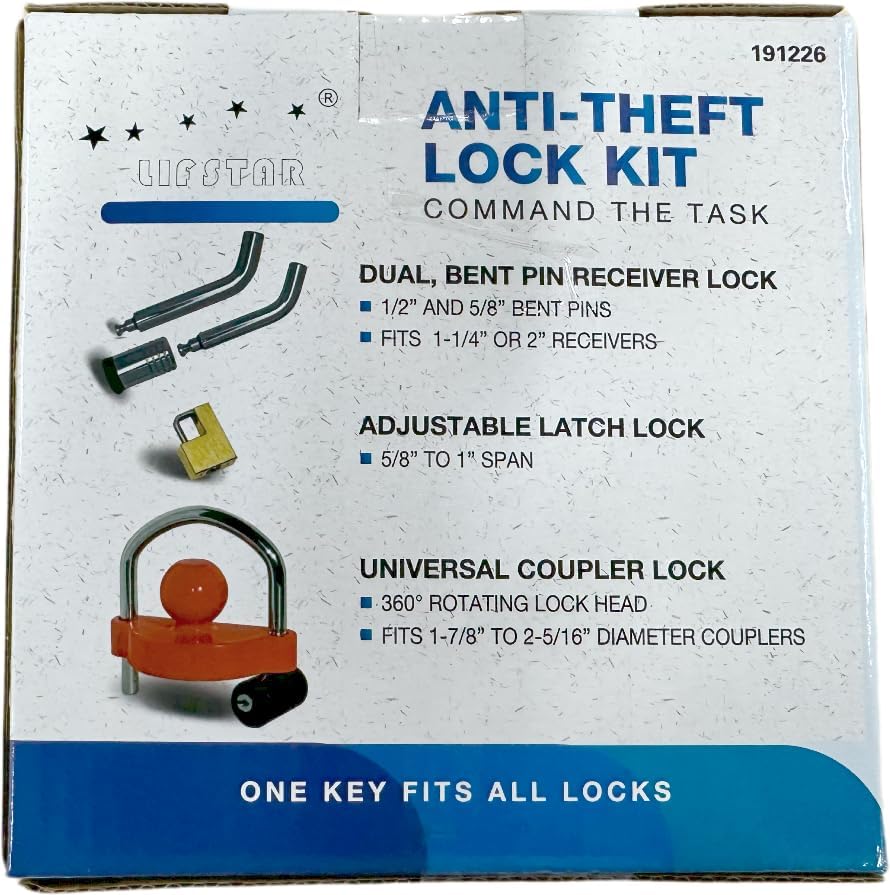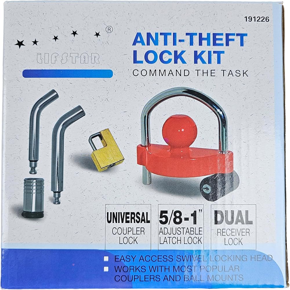 ### Product Description Secure your trailer with confidence using our Heavy-Duty Universal Trailer Hitch Lock Set. This comprehensive anti-theft kit includes everything you need to keep your trailer, boat, or other hitch-mounted equipment safe from theft. Featuring a universal coupler lock, a dual receiver lock, and an adjustable latch lock, this set is designed to provide maximum security and peace of mind. **Versatile and Universal Fit** Our trailer hitch lock set is designed to fit most popular couplers and ball mounts, making it a versatile choice for a wide range of trailers. The dual bent pins come in 1/2" and 5/8" sizes, suitable for both 1-1/4" and 2" receivers. The adjustable latch lock spans from 5/8" to 1", ensuring a snug and secure fit every time. **Convenient and Easy to Use** The easy access swivel locking head allows for quick and hassle-free locking and unlocking. The 360° rotating lock head on the coupler lock ensures comprehensive coverage and security, giving you complete peace of mind. Whether you're securing your trailer at a campsite, in storage, or at home, our lock set provides reliable protection. **Durable and Heavy-Duty Construction** Constructed from heavy-duty steel and brass, our trailer hitch lock set is built to withstand the toughest conditions. The robust materials ensure long-lasting durability and resistance to tampering, so you can trust that your trailer is always secure. Choose our Heavy-Duty Universal Trailer Hitch Lock Set for unbeatable security, convenience, and peace of mind. **Specifications:** - **Category:** Trailer Accessories - **Brand:** Lifstar - **Country of Origin:** China - **Material:** Heavy-duty steel, brass Invest in the best protection for your trailer with our comprehensive lock set. Don't take chances with your valuable equipment—lock it up and keep it safe!
