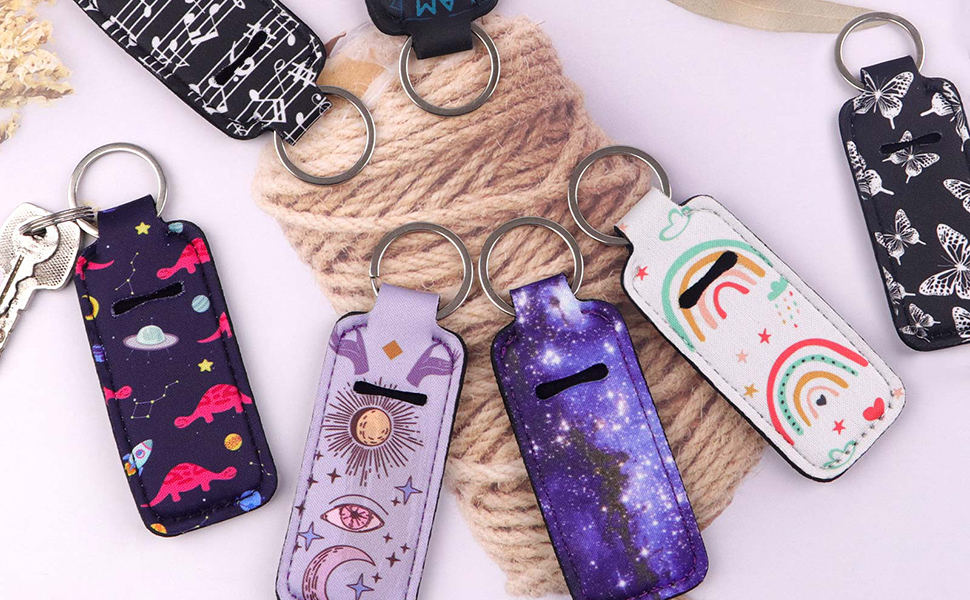 If you like some small and funny stuffs, find out from DMLSKY store. There are cute, original,bright and colorful styles waiting for you. This item comes with 4 pcs different design lip balm holder with key ring, so that you can change the style when you want.