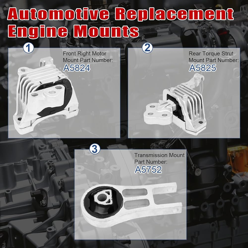 Mounting Positions: 1 x A5824 Front Right Motor Mount, 1 x A5825 Rear Torque Strut Mount, 1 x A5752 Transmission mount