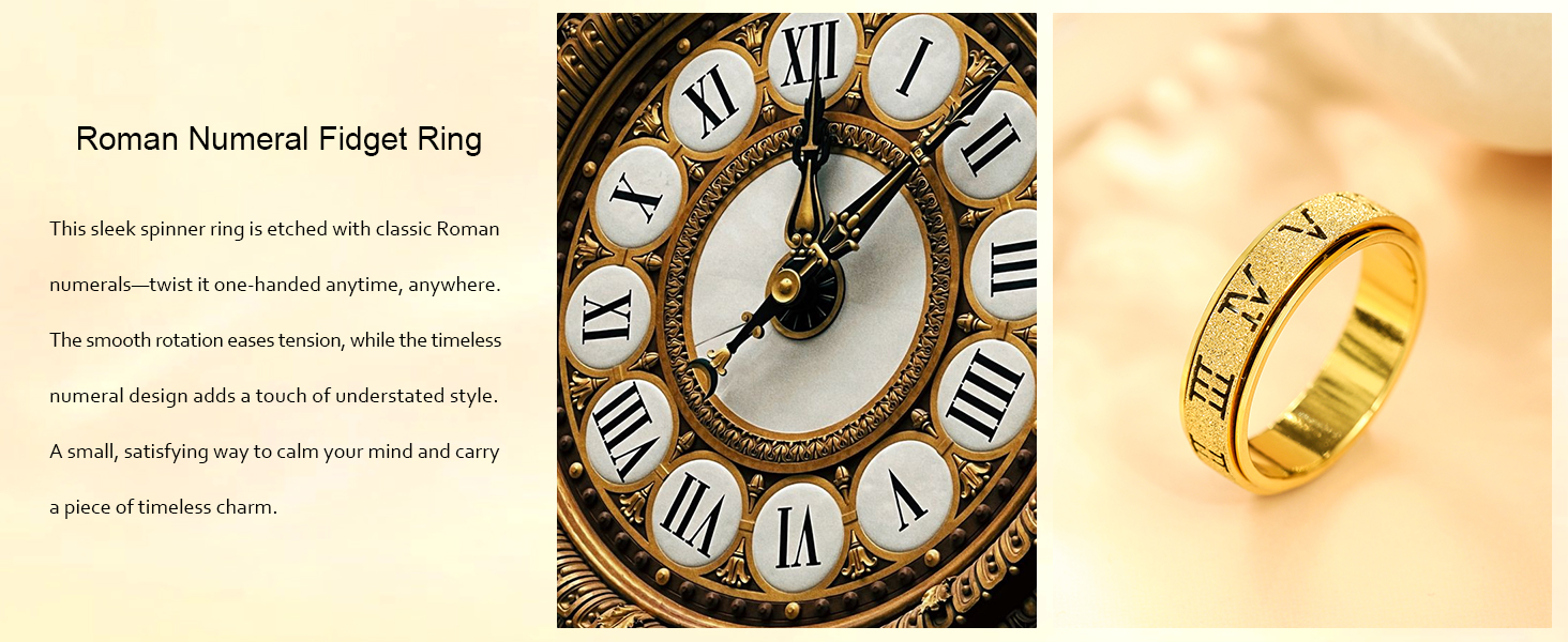 This elegant anxiety relief fidget ring combines sophisticated style with practical functionality, making it perfect for everyday wear or special occasions like weddings. The spinner ring features Roman numeral detailing on a smooth rotating outer band that provides a discreet way to relieve stress, anxiety, and nervous habits throughout your day. Crafted from high-quality stainless steel with a polished finish, this dainty thumb ring is built to last and maintain its beautiful appearance without tarnishing or fading. Available in multiple finishes including silver, gold, black, rainbow, and rose gold, this versatile fidget ring suits any personal style. The roman numeral design makes it a thoughtful gift for yourself or someone special. This women's statement ring comes in sizes 5 through 10 and is not resizable, so please select your correct size before ordering. The spinner mechanism allows the outer band to rotate smoothly around the inner band, providing a satisfying tactile experience that can help reduce fidgeting and promote focus. Whether you're at work, attending an event, or going about your daily routine, this stylish fidget ring offers both fashion and function in one beautiful accessory. The ring arrives in compact, secure packaging measuring 4 inches by 3 inches by 0.3 inches, making it an ideal gift choice.