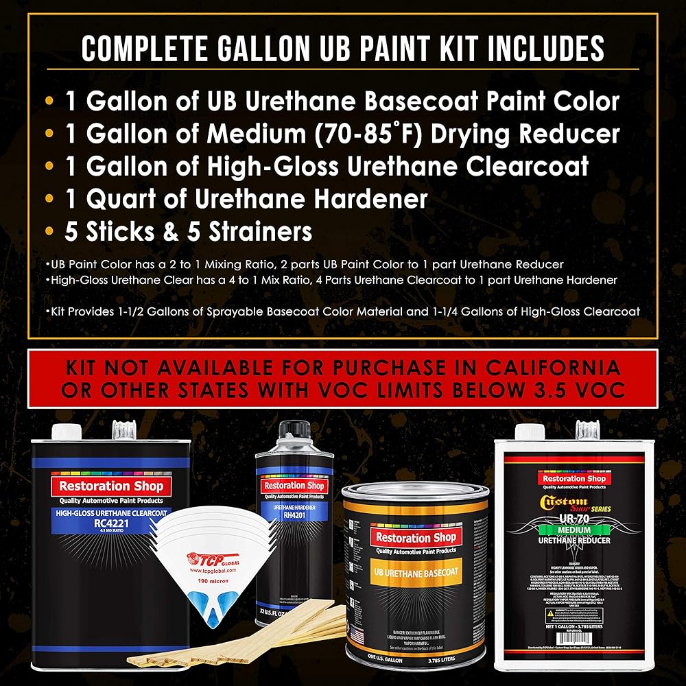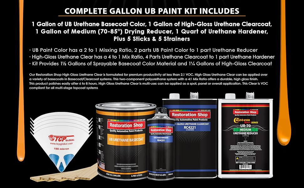 UB Paint Kit includes 1 Gallon of UB Urethane Basecoat Paint Color, 1 Gallon of UR70 Medium Urethane Reducer, 1 Gallon of RC4221 High-Gloss Urethane Clear, 1 Quart of RH4201 Urethane Hardener, 5 Pack of 190 Micron Nylon Automotive Strainers and a 5 Pack of Wood Paint Mixing Sticks.