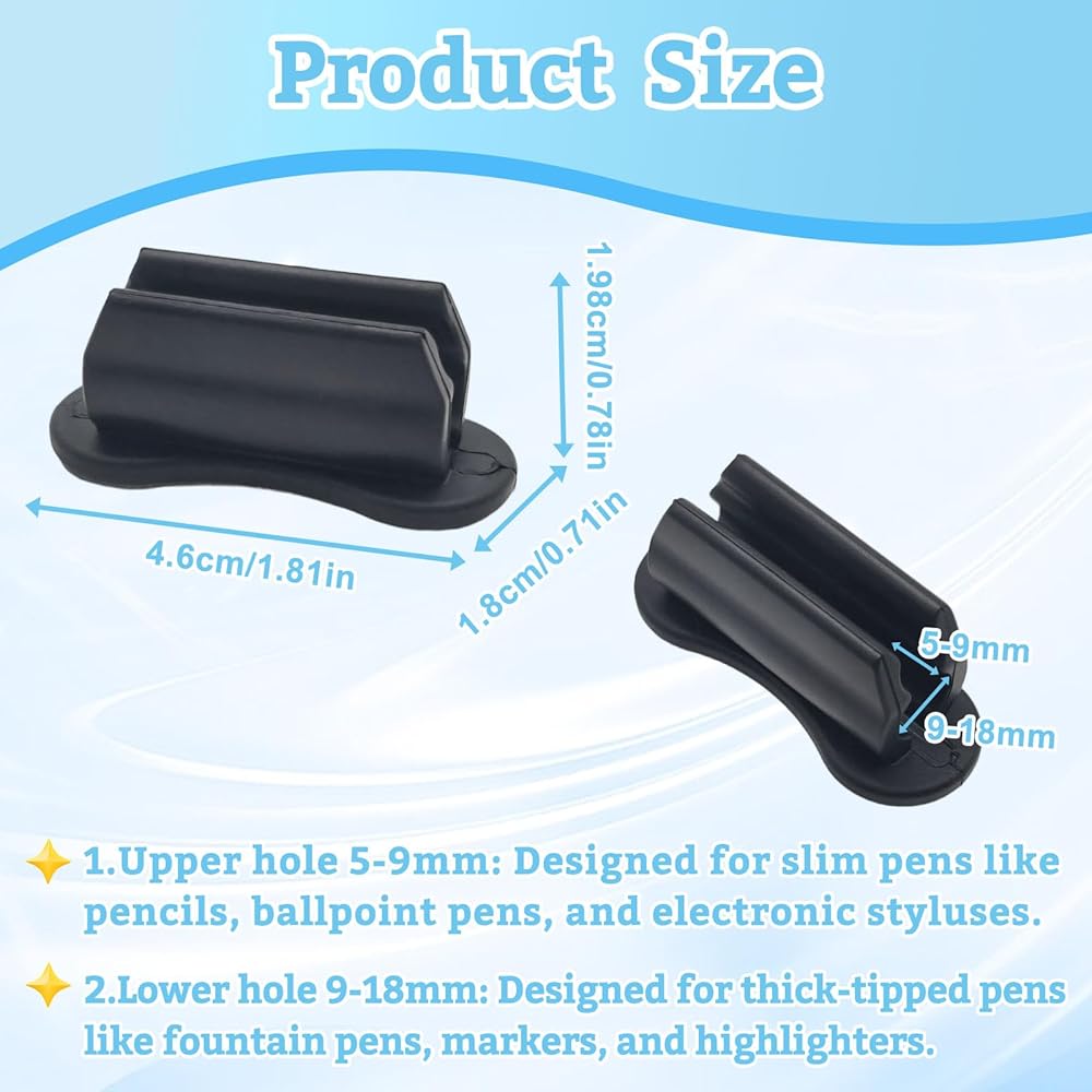 • Upgraded Two-Hole Design: Our adhesive pen holder features a dual-hole structure for cleverly compartmentalized storage. The upper hole, with a diameter of 5-9mm, is designed for slim pens like pencils, ballpoint pens, and electronic styluses; the lower hole, with a diameter of 9-18mm, easily accommodates thicker-tipped pens like markers and highlighters. The anti-slip texture on the interior ensures that pens of all sizes are securely stored and neatly organized.