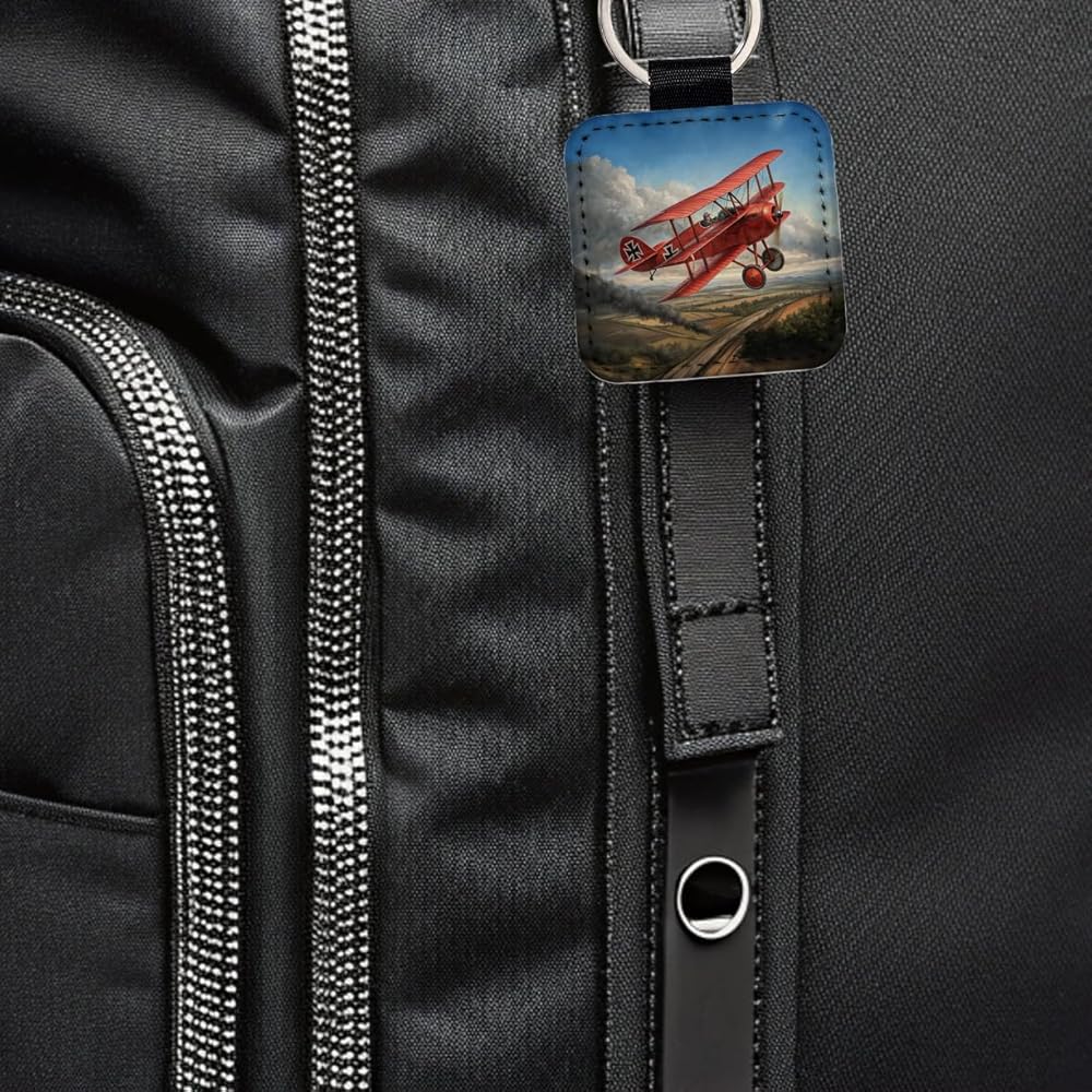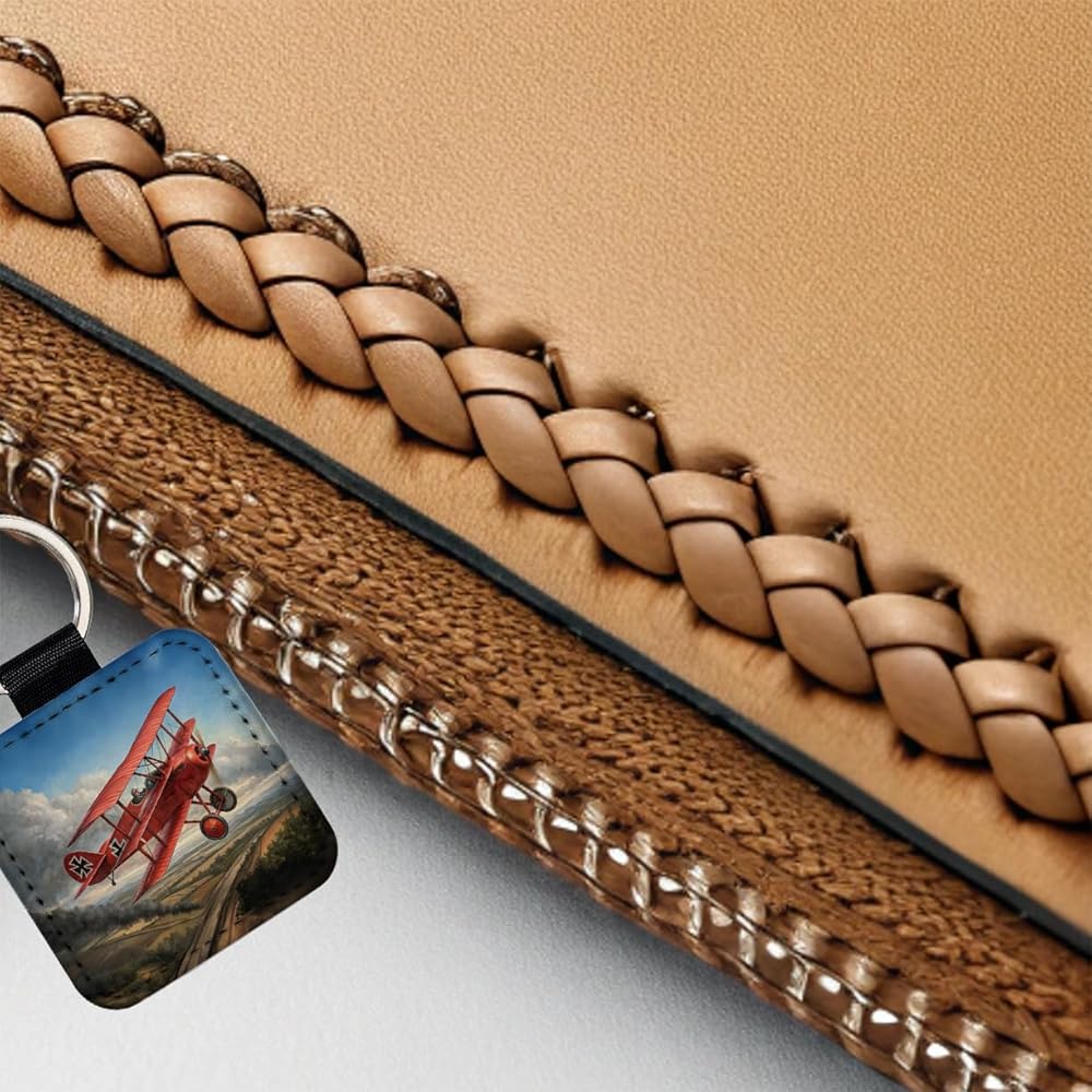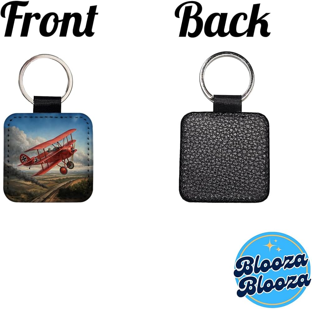 This sleek and durable keychain combines practicality with a touch of style and features our unique printed design "Red Baron's WWI Fokker Triplane". The sturdy keyring ensures your keys stay securely attached, while the compact design makes it easy to carry in your pocket or bag. Whether as a gift or a personal accessory for yourself, this keychain is the perfect blend of functionality and modern design, ready to accompany you on all your daily adventures. The keychain is made of faux leather with the image shown printed on one side, while the other side is black. It is approximately 2.0" x 3.25" x 0.2" in size and is sold individually.