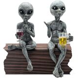 Bring an otherworldly touch to your home decor with these captivating alien figurines. Crafted with meticulous detail, these extraterrestrial beings are sipping beverages from small glasses. Their textured bodies and oversized eyes give them an undeniably alien appearance, yet their relaxed poses make them seem almost human-like. Whether you're a fan of science fiction or just appreciate unique decorative pieces, these alien figurines are sure to spark conversation and add a touch of whimsy to your living space. Measuring approximately 10 inches in height, they make for an eye-catching centerpiece on a bar shelf, mantel, book shelf or coffee table. Embrace the unknown and let these enigmatic visitors from beyond the stars transport you to a realm of imagination.
