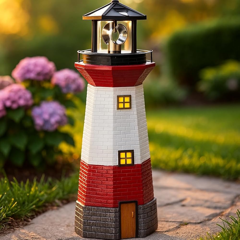 SOLAR-POWERED BEAUTY FOR EFFORTLESS ILLUMINATION : Enjoy ambient lighting without the hassle of wires or electricity. This solar lighthouse charges by day and automatically lights up at dusk, rotating gracefully to bring warmth and charm to your garden every night. Let your outdoor space glow with elegant simplicity.