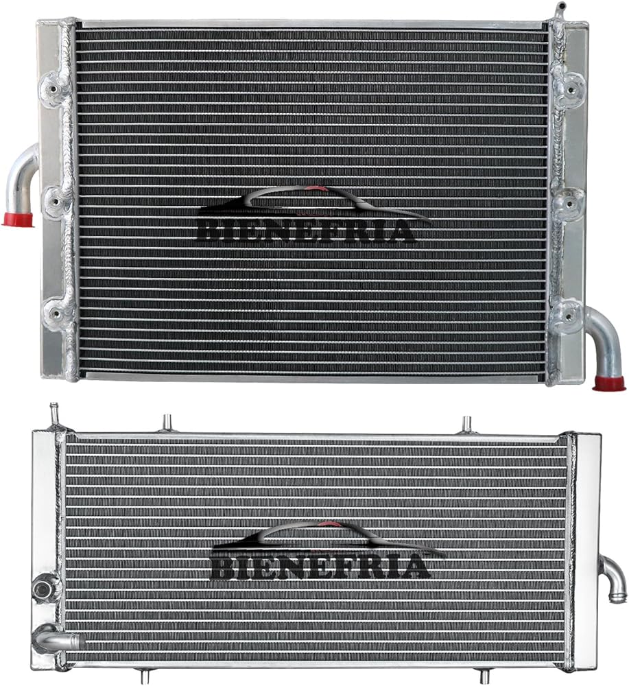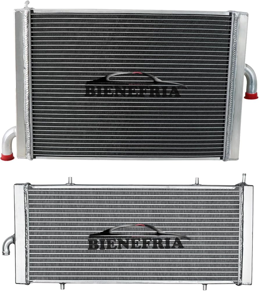 Complete 2-Piece Set - Includes 1 main aluminum radiator (Core:13 7/10"Hx17 9/10"W; Overall:14 4/5"Hx24 1/5"W) + 1 auxiliary radiator (Core:21 1/6"x10 1/3"; Overall:25 5/8"x12 1/4"). 3/4" inlet/outlet for seamless coolant circulation
