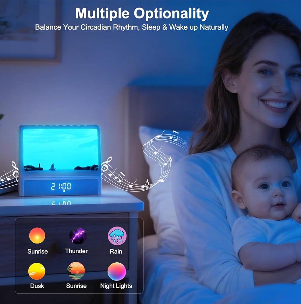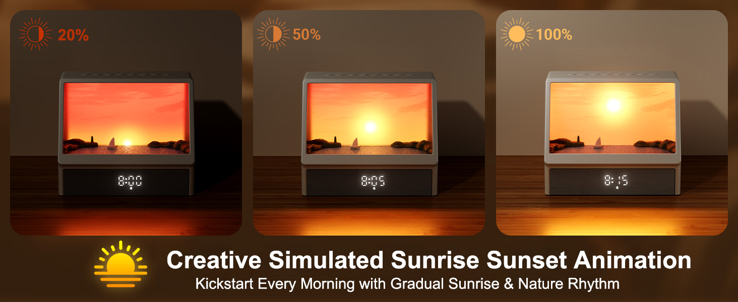 IMMERSIVE SUNSET & WEATHER ANIMATIONS - Experience something no ordinary wake-up light offers: creative sunrise, sunset, thunderstorm, and rainfall animations that paint your space in dynamic color and motion. The animated scenes, accompanied by a variety of lifelike natural sounds, create an immersive experience. Wind down as the “sun” sets or fall asleep to calming storm visuals—transforming your bedroom into a peaceful sanctuary and elevating your nighttime routine.