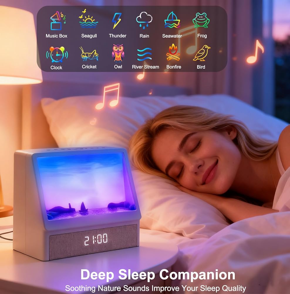 Sunrise Alarm Clock for Bedrooms, White Noise Machine Creative Simulated Sunrise Animation with 7 Modes, 12 Natural Sounds, Music Speaker & Remote, Wake Up Light Sunset Lamp Gifts for Heavy Sleepers