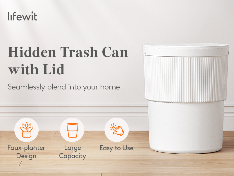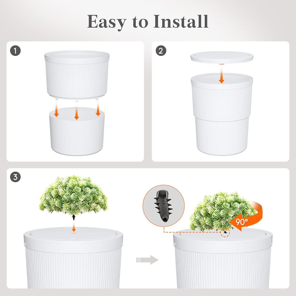 Hidden Trash Can: Designed to seamlessly blend into your home, our trash can with lid features a faux-planter design; the upper striped and lower frosted sections perfectly mimic a real flowerpot, while the lifelike faux plant on top adds an elegant touch to any space