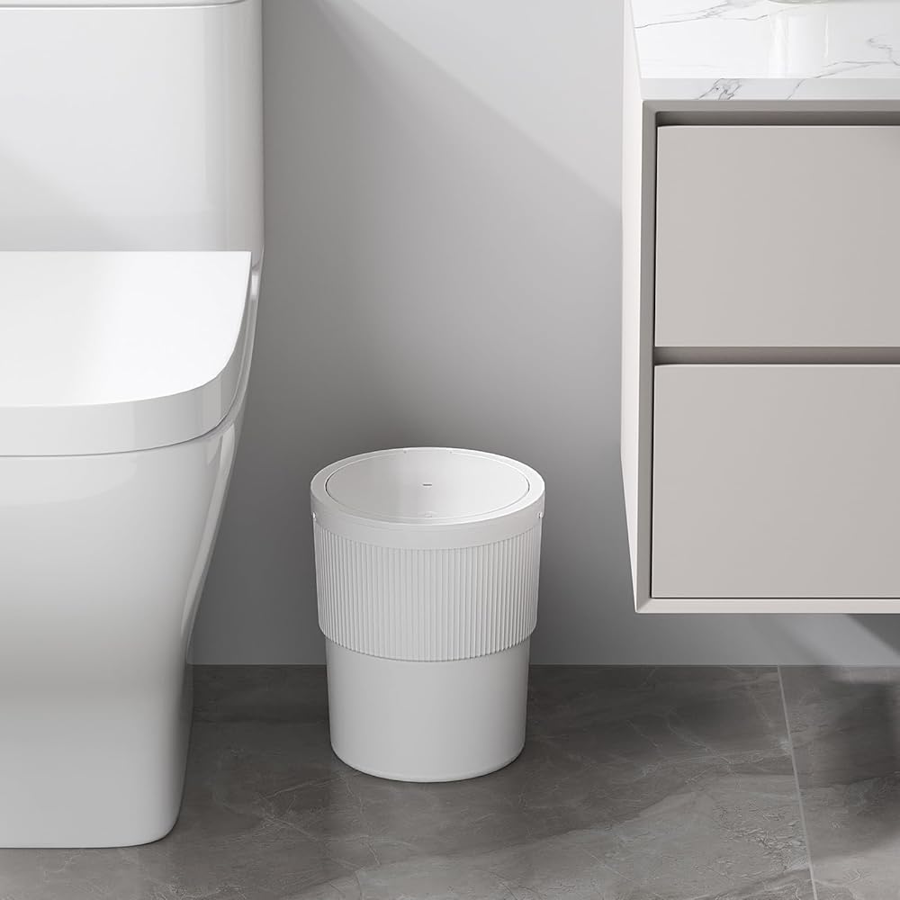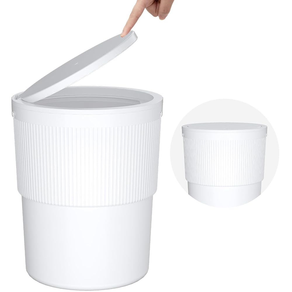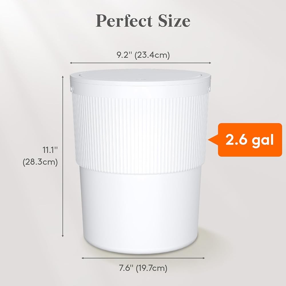 Perfect Size: This bathroom trash can features a rounded design that easily fits into small spaces; suitable for bathrooms, offices, bedrooms, etc; dimensions: 9.2 x 9.2 x 11.1 inches (23.4×23.4×28.3 cm), with a capacity of 2.6 gallons (10L)