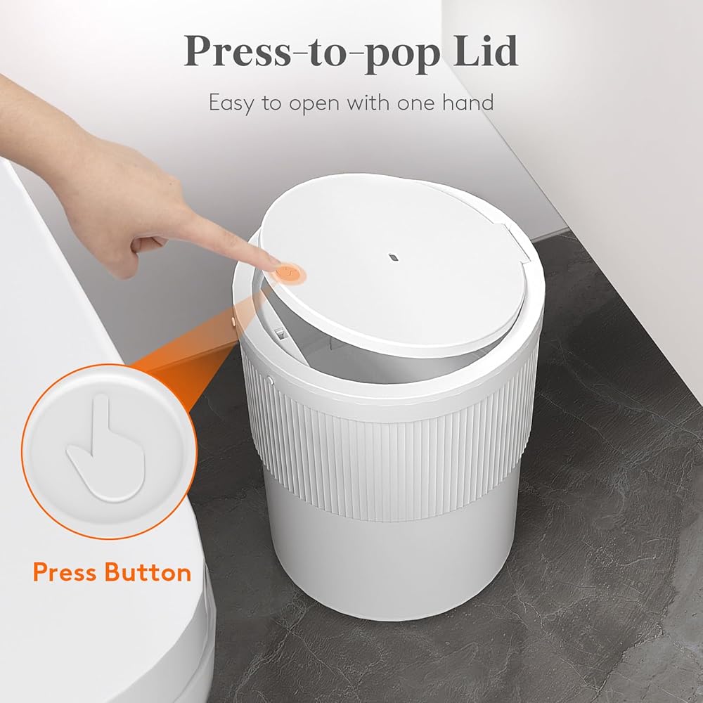 Pet-proof: This trash can with lid features a push-button pop-up lid to prevent your puppy or kitten from opening or rummaging through the bin, keeping the environment clean