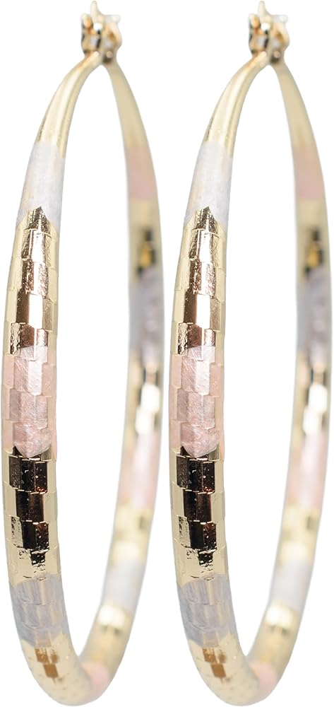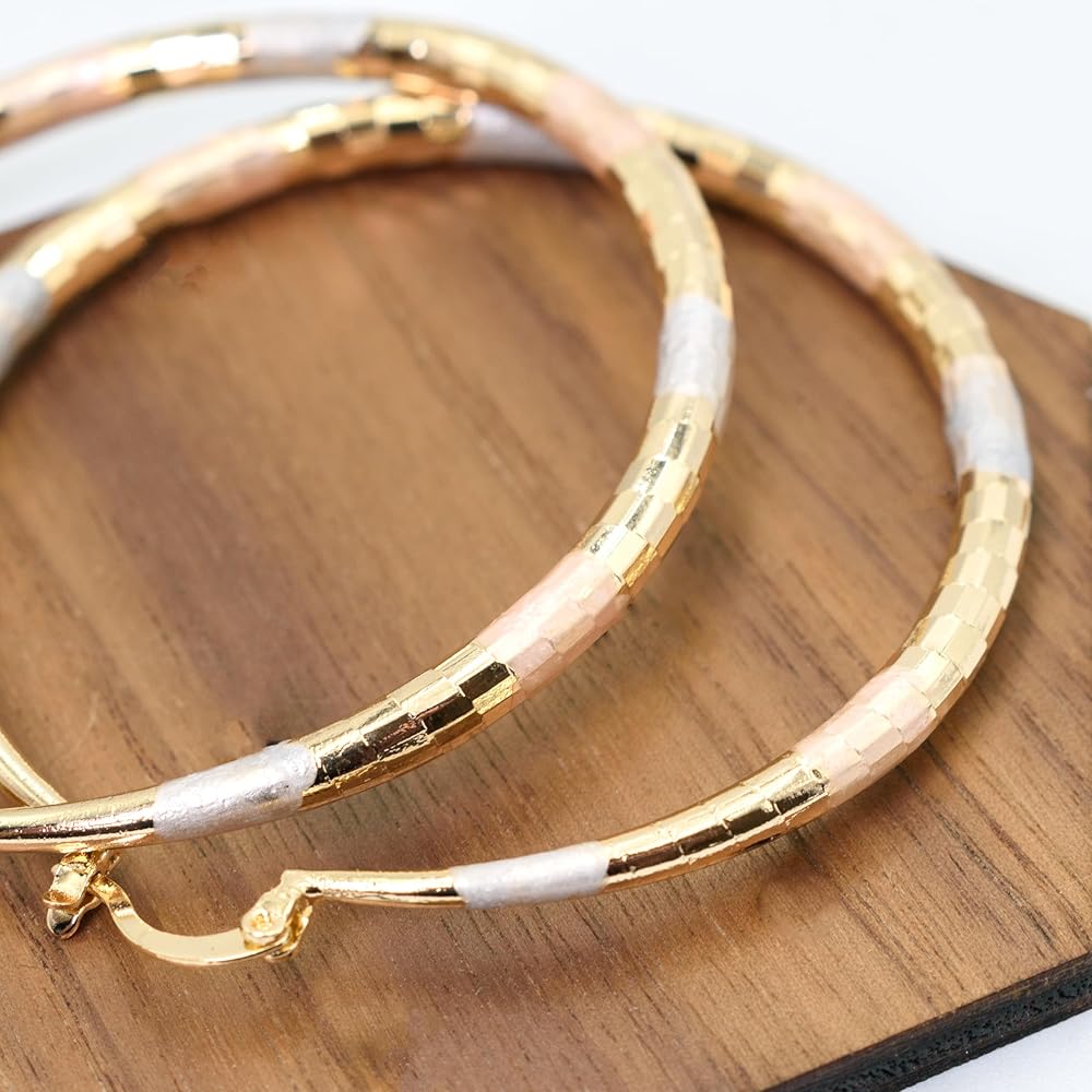 2.36" Inch Diamond Laser Cut Texture Tri-Tone Hoop Earrings, Painted Rose Gold Yellow Gold Silver Tone, 18k Gold Filled Plated