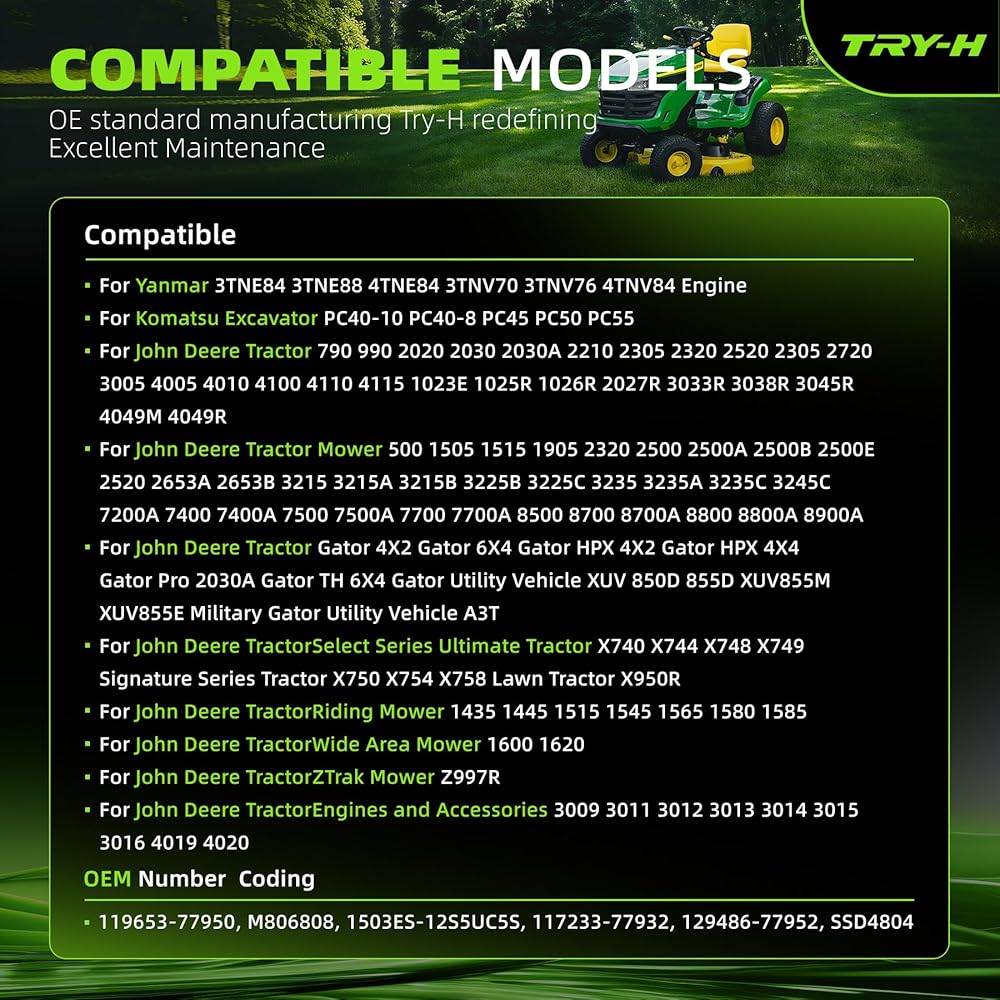 Compatible with: Yanmar 3TNE84, 3TNE88, 4TNE84, 4TNV84 Engine; Komatsu Excavator PC40-10, PC40-8, PC45; John Deere Tractor 790, 990, 2020, 3005, 4005; John Deere Tractor Mower 500, 1505, 1905, 2320; John Deere TractorGator 4X2, Gator 6X4, 850D; John Deere TractorSelect Series Ultimate Tractor X740 X744 X748 X749 Signature Series Tractor X750 X754 X758 Lawn Tractor X950R; John Deere TractorRiding Mower 1435, 1445, 1515; John Deere TractorWide Area Mower 1600, 1620, etc.