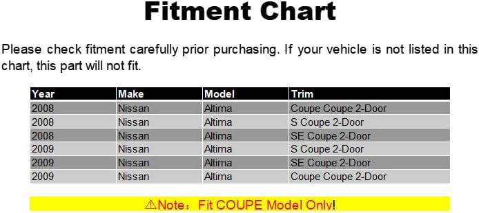 Application: This MagicDrift front bumper lip is specifically designed to Fits 2007-2009 Nissan Altima Coupe Only. (Please Note: This item has great fitment on OEM bumpers, will NOT fit aftermarket bumpers. )