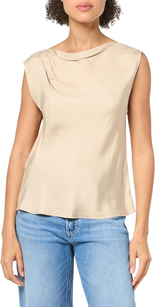 Cut with an elegant high neck and cap sleeves, our silk-blend twill blouse is finished with soft asymmetric draping.