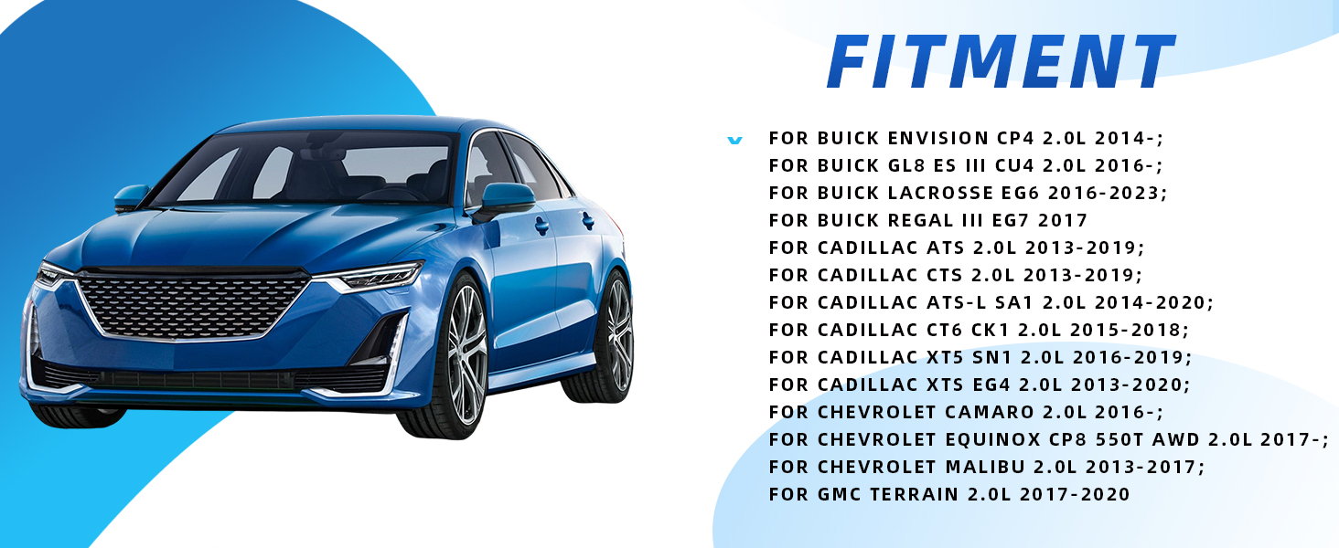 Fitment: For Buick Envision CP4 2.0L 2014-; For Buick GL8 ES III CU4 2.0L 2016-; For Buick Lacrosse EG6 2016-2023; For Buick Regal III EG7 2017 For Cadillac ATS 2.0L 2013-2019; For Cadillac CTS 2.0L 2013-2019; For Cadillac ATS-L SA1 2.0L 2014-2020; For Cadillac CT6 CK1 2.0L 2015-2018; For Cadillac XT5 SN1 2.0L 2016-2019; For Cadillac XTS EG4 2.0L 2013-2020; For Chevrolet Camaro 2.0L 2016-; For Chevrolet Equinox CP8 550T AWD 2.0L 2017-; For Chevrolet Malibu 2.0L 2013-2017; For GMC Terrain 2.0L 2017-2020