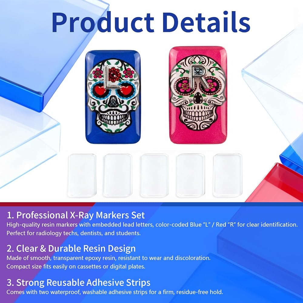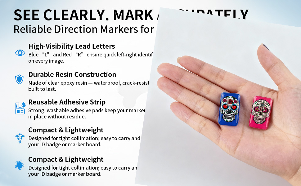 X-Ray Markers: Set of two premium-quality X-ray markers crafted from smooth, durable resin. Each marker measures approximately 0.7" x 1.25" (18mm x 30mm) with ½" lead letters. Color-coded for clarity — R in red and L in blue. No initials included.