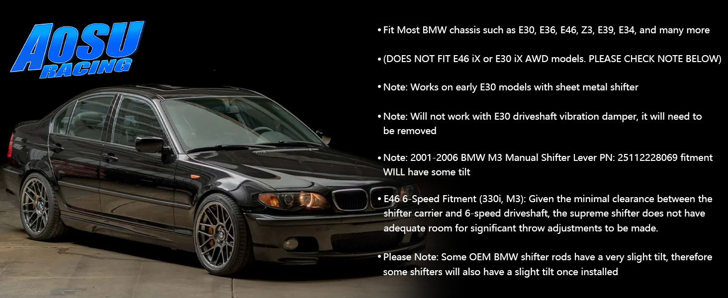 E46 6-Speed Fitment (330i, M3): Given the minimal clearance between the shifter carrier and 6-speed driveshaft, the supreme shifter does not have adequate room for significant throw adjustments to be made