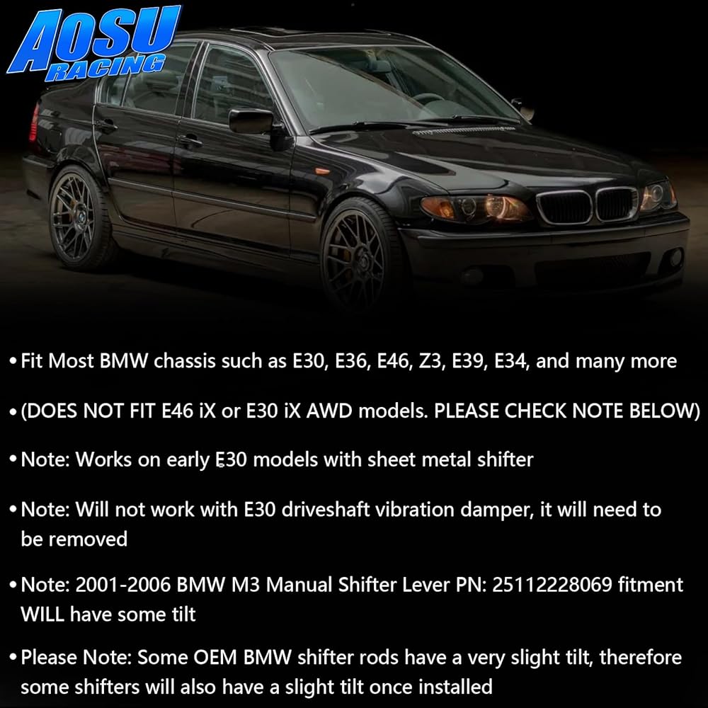 Note: Works on early E30 models with sheet metal shifter; Will not work with E30 driveshaft vibration damper, it will need to be removed; 2001-2006 BMW M3 Manual Shifter Lever PN: 25112228069 fitment WILL have some tilt