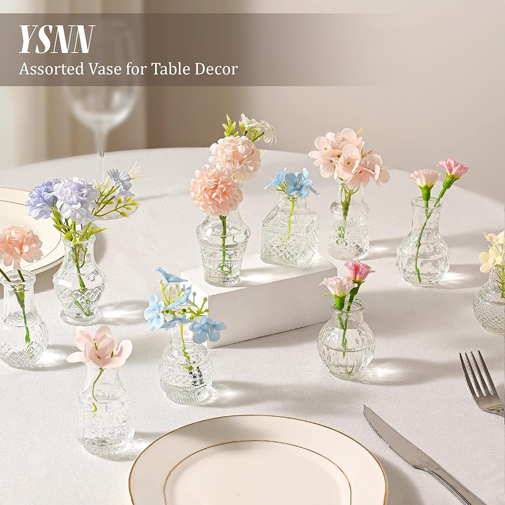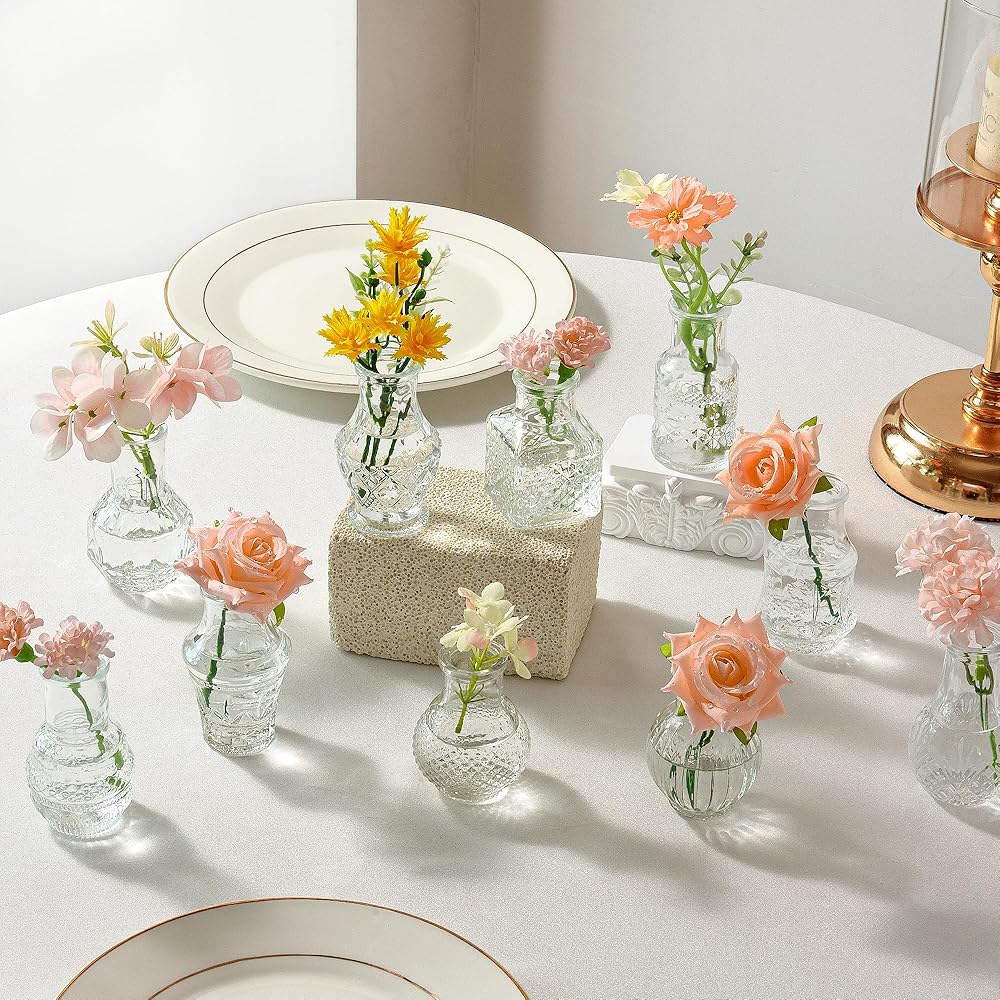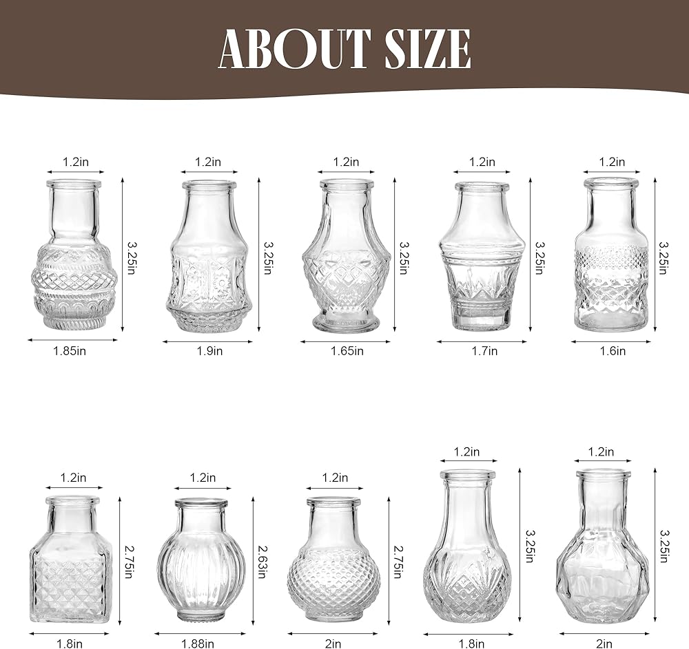 Mini Clear Glass Vase Set:These elegant flower vases with 2 sets of 10 different shapes and sizes of small glass vases for flowers the vases have a bumpy pattern and are holding it in your hand makes you unable to put it down.