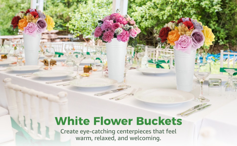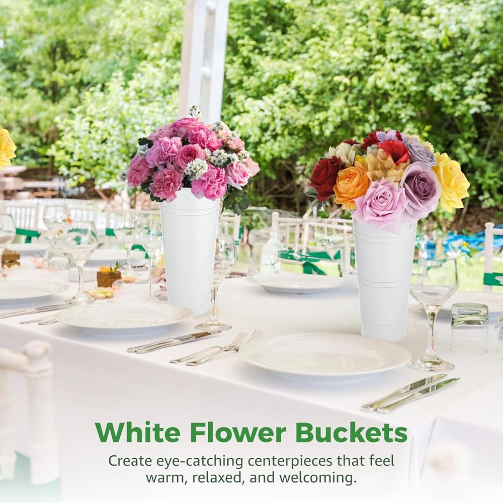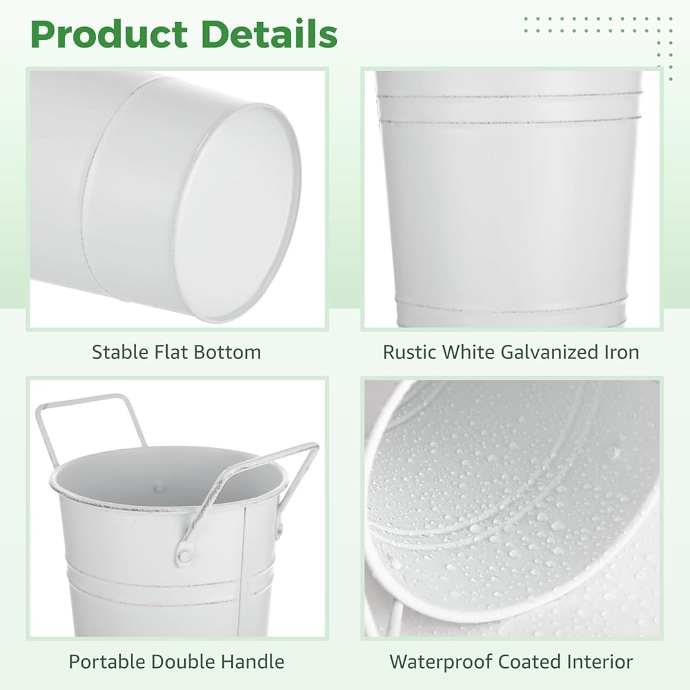 8 Pcs White Flower Buckets, Galvanized Metal Flower Vases, Rustic Farmhouse Floral Buckets with Handles, French Country Decor Containers for Wedding Centerpieces