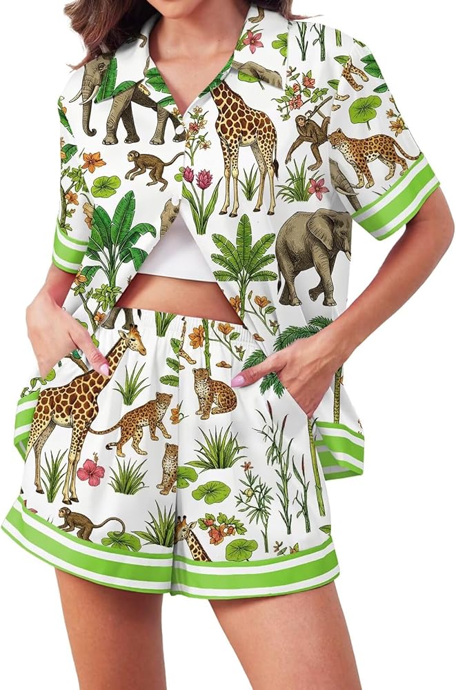 Womens pajama sets shorts/ animal print pajamas for women/ leopard print pajamas/ cheetah pajamas for women/ summer pajama sets for women shorts/ floral print summer pjs for women set/ short sleeve satin pajama set for women/ pink silky pajama set for women/ loungewear for women 2 piece set/ blue floral pajama set for women/ green summer sleepwear for women