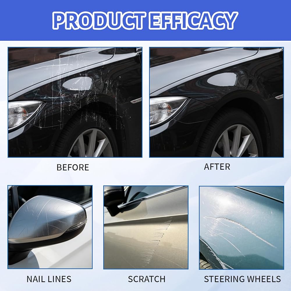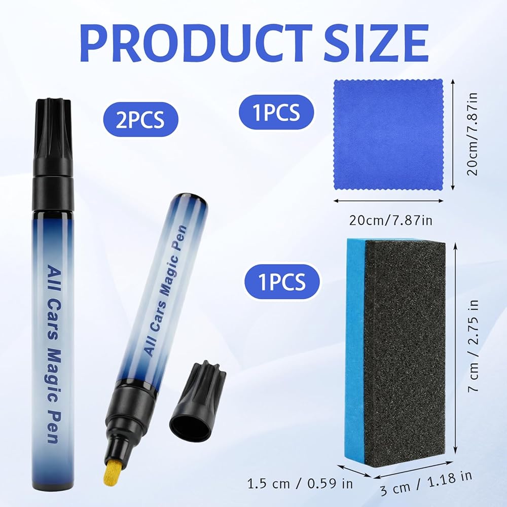 Magic Car Scratch Removal Pen, All Cars Magic Pen for Car Scratches, Quick Fix for Minor Paint Damage, 2 Pens with Sponge and Towel, 4-Piece Car Scratch Remover Kit Quick Scratch Repair: The magic car scratch removal pen effectively minimizes minor scratches and scuffs on your vehicle's surface; Its easy-to-use design allows for precise application, delivering a seamless finish without professional tools Universal Compatibility: This all cars magic pen works with various paint colors, providing a hassle-free solution for quick touch-ups; The included sponge and towel ensure a smooth application process Portable and Convenient: The compact design of this car scratch remover pen makes it ideal for on-the-go repairs; Keep it in your car for immediate use whenever minor scratches appea Easy Application: Simply apply the car scratch remover pen to the affected area, use the sponge to blend, and wipe clean with the towel; No special skills or additional equipment required Complete Repair Kit: This 4-piece set includes two magic car scratch removal pens, one sponge, and one towel, offering everything needed for quick and effective scratch repair