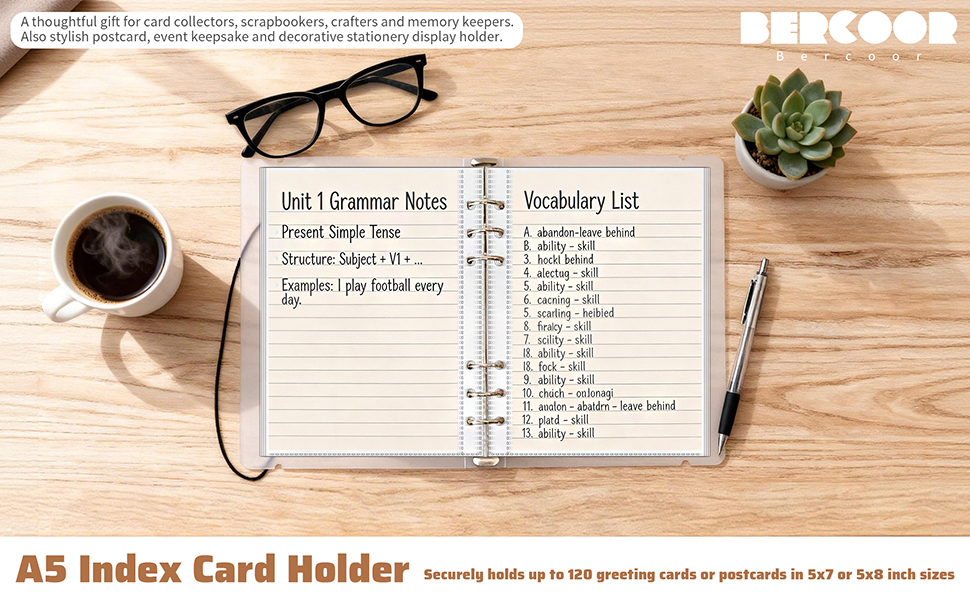 Bercoor 5x8 Index Card Binder Holder, A5 6 Ring Binder, Small Storage Organizer for Photos, Postcards, Recipe Cards, 60 Card Sleeves, Stores up to 120 Pieces Card