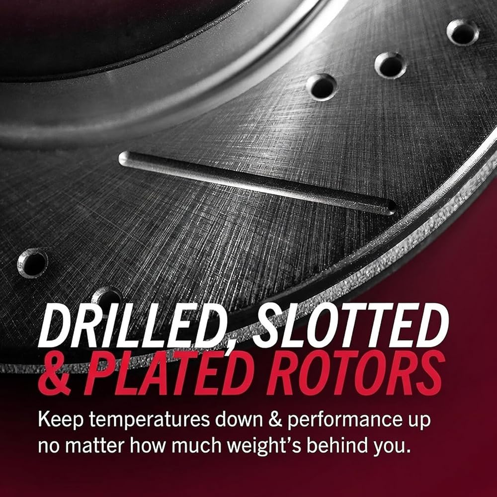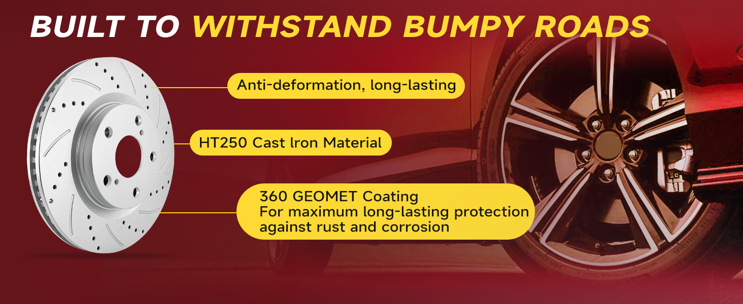 Performance Improvement: Performance Improvement: Engineered with drilled and slotted design, the rotors (made of G3000 cast iron/high-carbon alloy) effectively boost heat dissipation, clear dust and debris, and prevent brake fade for consistent stopping power even under heavy loads or emergency braking. Featuring non-directional surface treatment for smoother pad bedding-in and reduced vibration, plus high-precision dynamic balancing to eliminate steering wheel shake for a stable driving experience. Coated with water-based Geomet or premium zinc, the rotors resist rust, corrosion, and damage from road debris/chemicals; the Geomet coating even self-repairs to extend service life.