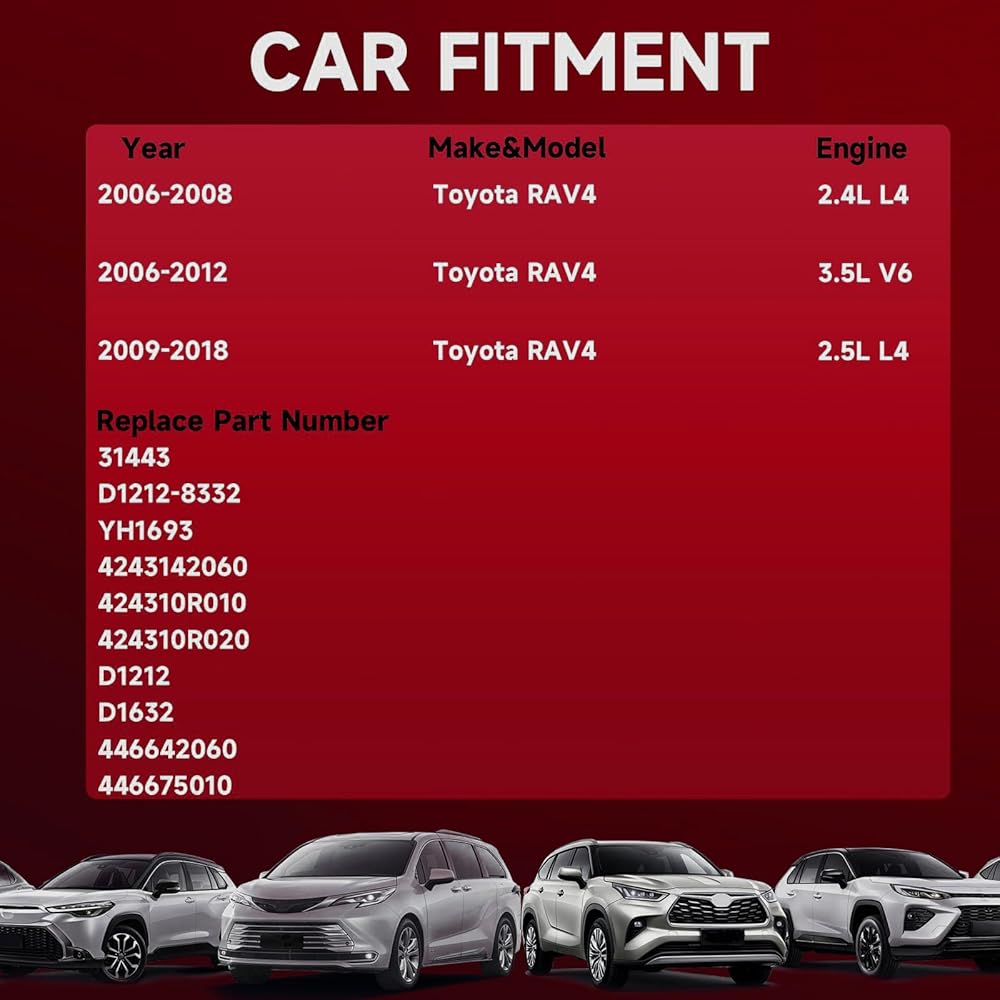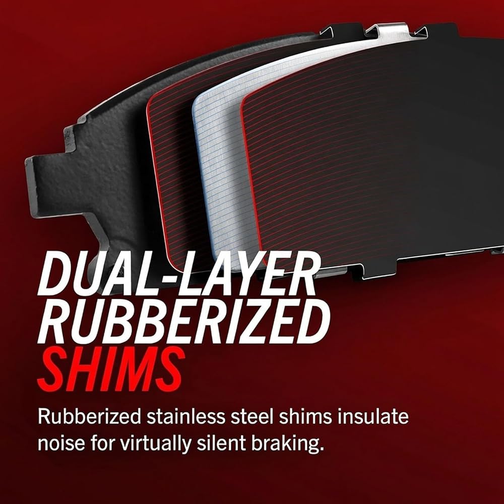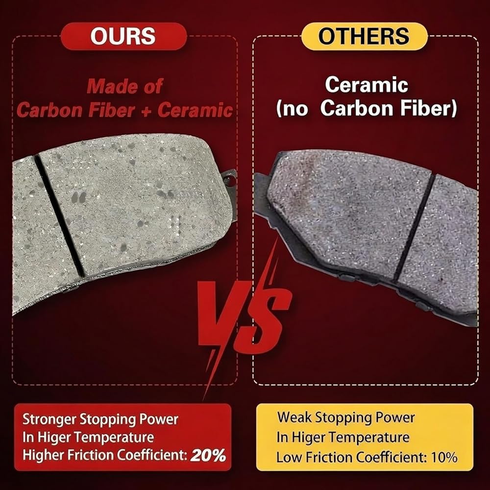 Ceramic Brake Pads: Crafted with premium ceramic formula, the pads deliver exceptional wear resistance and anti-fading properties. Their chamfered design and integrated vibration-damping shims ensure a tight fit with rotors, effectively reducing braking noise for a serene cabin environment. The ceramic material generates minimal dust, keeping wheels clean, while maintaining reliable pedal response for daily driving needs.