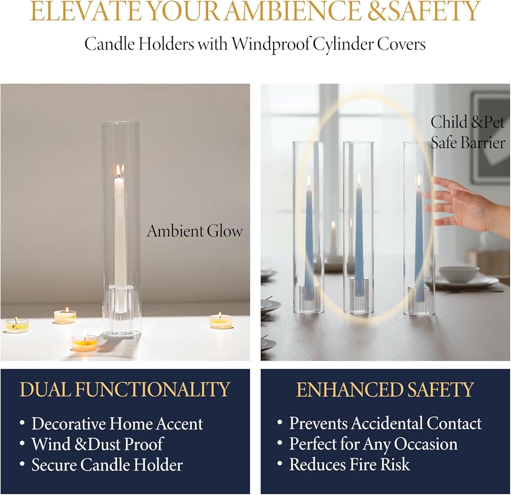 Dramatic 14" Tall Visual Impact:Stunning Glass Hurricane Taper Candle Holder. Command attention with our impressive 14-inch tall hurricane candle holder covers. Their extended height creates a superior visual impact, beautifully showcasing your taper candles.