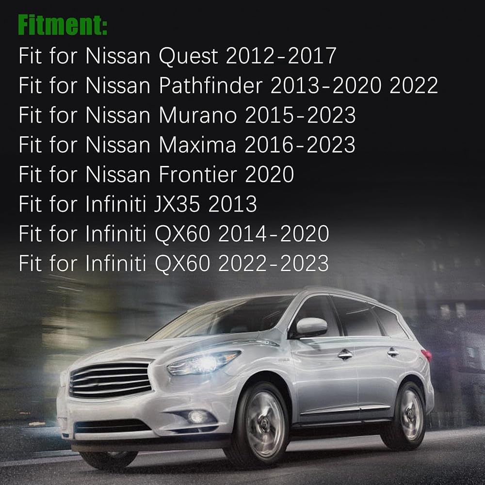 Fitment: Fit for Nissan Quest 2012-2017, for Pathfinder 2013-2020/2022, for Murano 2015-2023, for Maxima 2016-2023, for Frontier 2020; for Infiniti JX35 2013, QX60 2014-2020, QX60 2022-2023