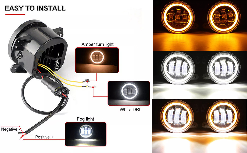 4 inch led fog light: 6500K fog light, with white DRL and amber turn dignal. Halo ring design, enhance the look and performance of your vehicle with the next generation of led lighting. Package including: 2pcs led fog light + 2pcs H11 conversion adapter wires.
