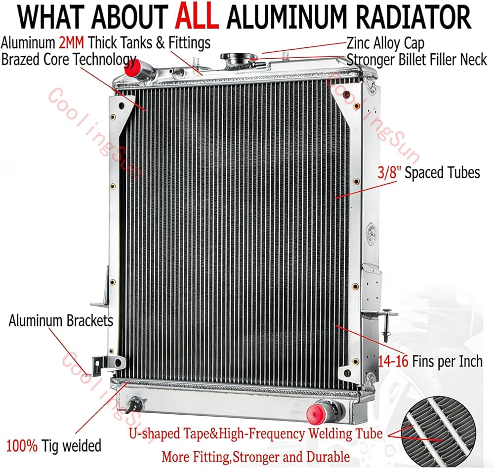 The core of the radiator is welded in vacuum brazing furnace, no epoxy.The Radiator are 100% welded by TIG.Stronger & Higher Capacity for Coolant than OEM units,Made of High Quality Full Aluminum Construction.