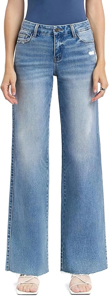 Vervet Jeans Mid Rise Clean Cut Raw Hem Long Length Wide Leg Jeans - Basic 5 pocket, Mid rise waist, Slight Stretchy, Clean cut raw hem, Full length, Relaxed wide leg