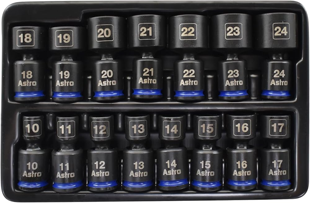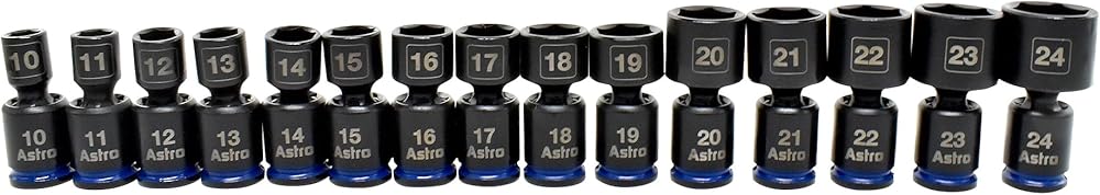 Introducing the Astro Tools 78315 15-Piece 3/8" Drive Pinless Universal Impact Socket Set, our first 3/8” drive universal set to go up to 24mm, plus there's absolutely no skipped sizes! Engineered for modern, high-powered impacts, this comprehensive set uses Astro's proprietary "Anti-Floppy" Pinless Design and our latest thicker retaining collars to keep the socket halves together for the long. New to 2026, these now also feature large roll stamped sizes on the back of each socket making for 3 different size locations for easy identification. Our pinless impact universal sockets deliver a full 360 degree range of motion without the common issue of joints going loose or wobbly under heavy load or shearing at a pin. Constructed from durable forged CRO-MO steel this set by backed by Astro's simple lifetime warranty.