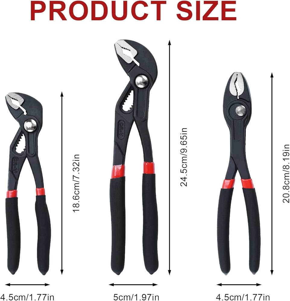 【Professional Grade Set】- This Plier Set includes 7-inch, 10-inch Groove Joint Pliers and 12-inch Slip Joint Pliers designed for versatile applications. The slip-joint design allows for easy adjustments to accommodate various items, making it a reliable choice for professionals.