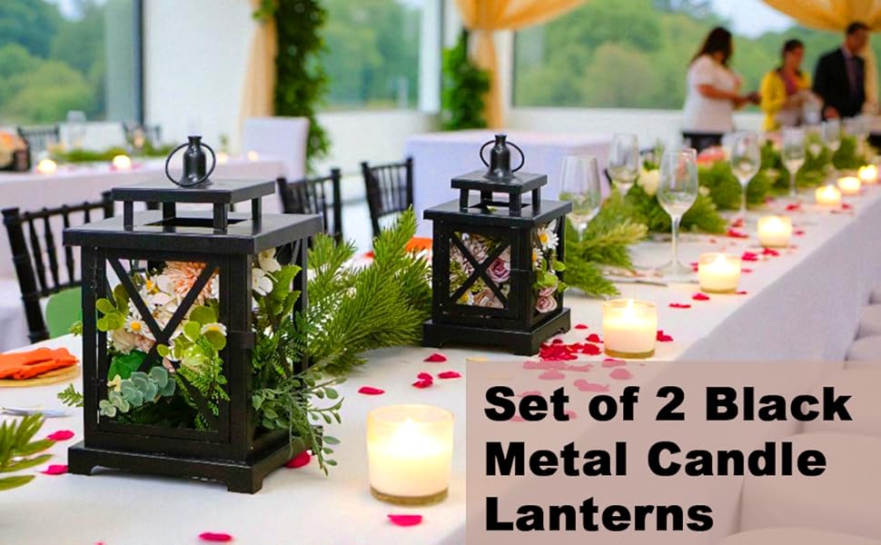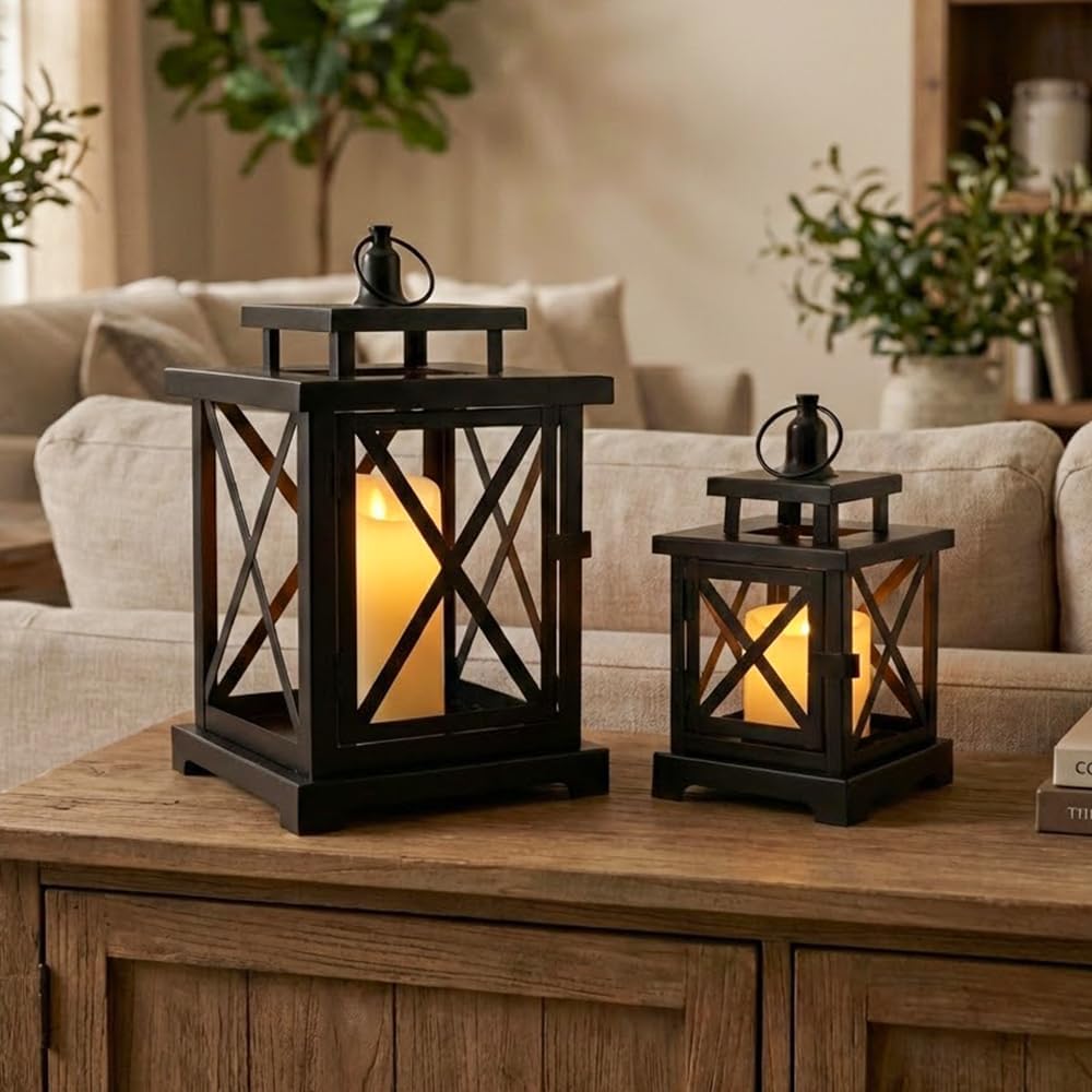 JHY DESIGN 2-Pack Vintage Metal Decorative Lantern 12.5" & 9" H Hanging Lantern with Flickering LED Pillar Candles for Garden Living Room Indoor Outdoor Parties Weddings Balcony(Black)