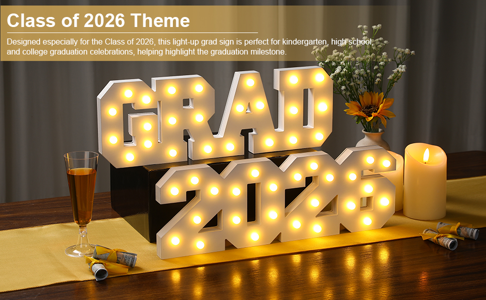 Class of 2026 Theme:Designed especially for the Class of 2026, this light-up grad sign is perfect for kindergarten, high school, and college graduation celebrations, helping highlight the graduation milestone.