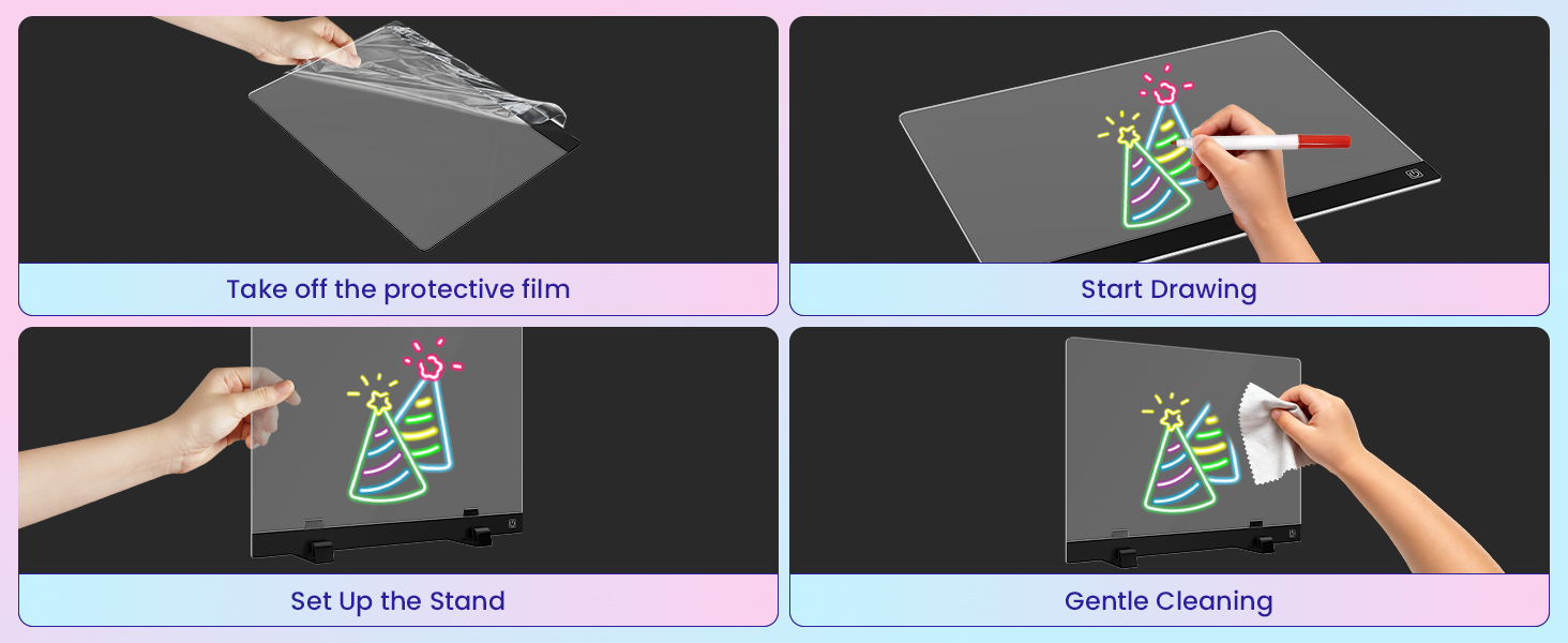 A Glowing Gift That Inspires Creativity: Light up drawing board for kids features vibrant color effects, seven light modes, and smooth 10%–100% dimming to make every drawing shine. The customizable glow adds a magical touch to creative play, making it a thoughtful gift for birthdays, holidays, or special occasions
