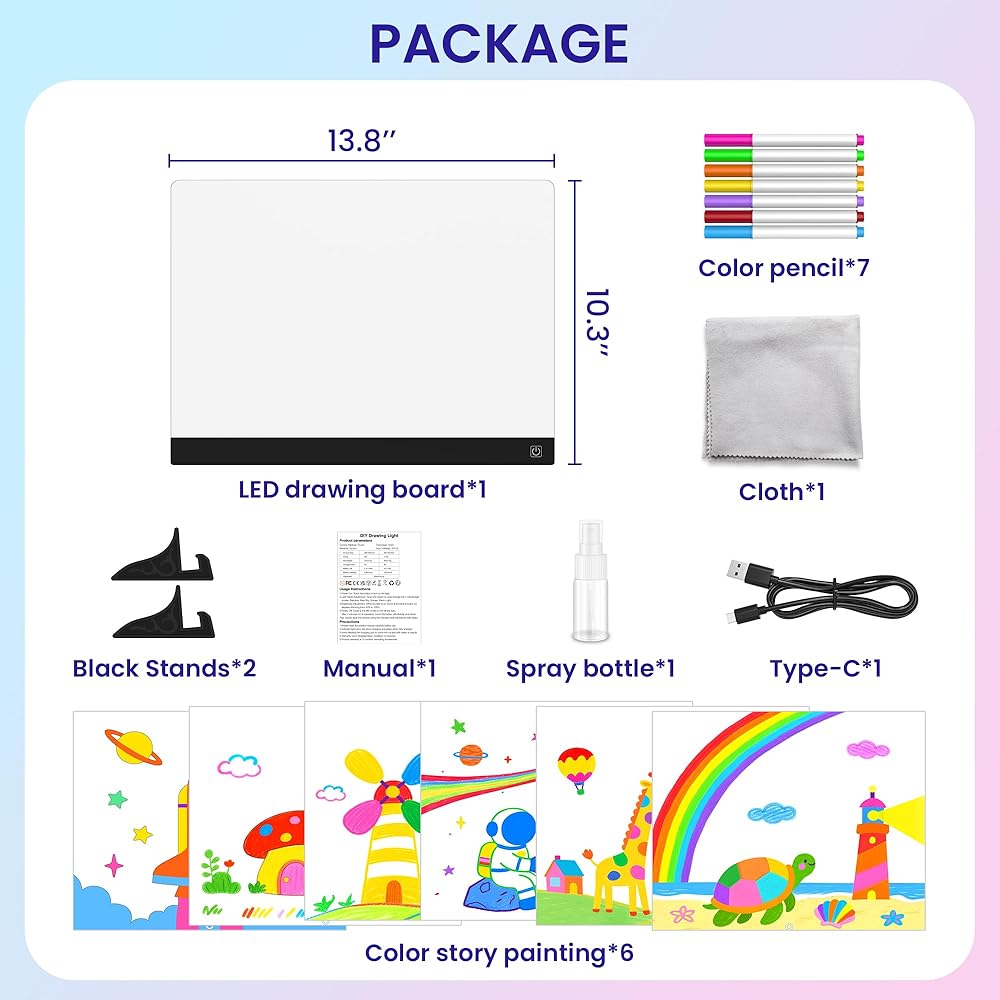 All-in-One Art Kit with Vibrant Colors: Led note board with colors includes 2 stands, a USB charging cable, a cleaning cloth,a watering can, 7 colorful brushes, and 6 tracing templates. The smooth dry-erase acrylic surface allows easy wiping for repeated drawing, making it a convenient, ready-to-use creative set for kids
