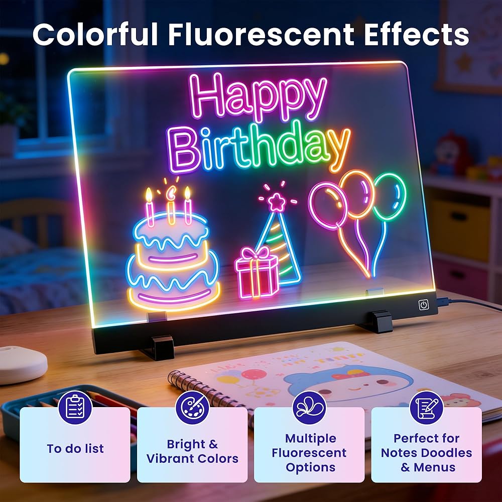 Learn Through Play, Inspire Creativity and Focus: This LED note board features a spacious 16-inch durable acrylic surface, giving kids plenty of room to draw and write freely. Ideal for everyday creative use, it supports storytelling, journaling, and imaginative play. Adjustable brightness helps soften glare for a more comfortable drawing experience at home
