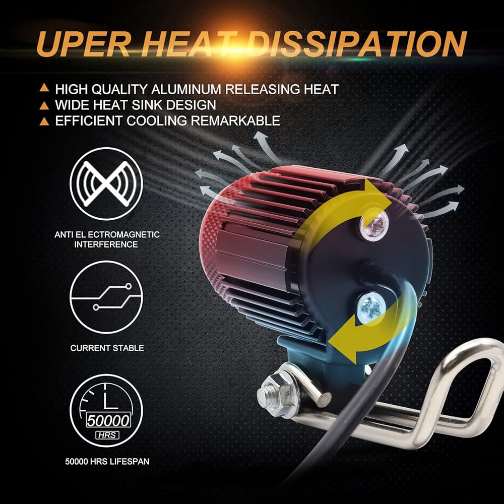 【Long Lifespan】- This small motorcycle LED Fog Lights well match your motorcycle, trucks, SUV, etc. Efficient cooling system with special designed thermal fins prolong the lifespan for the driving fog lights over 50,000 hours.